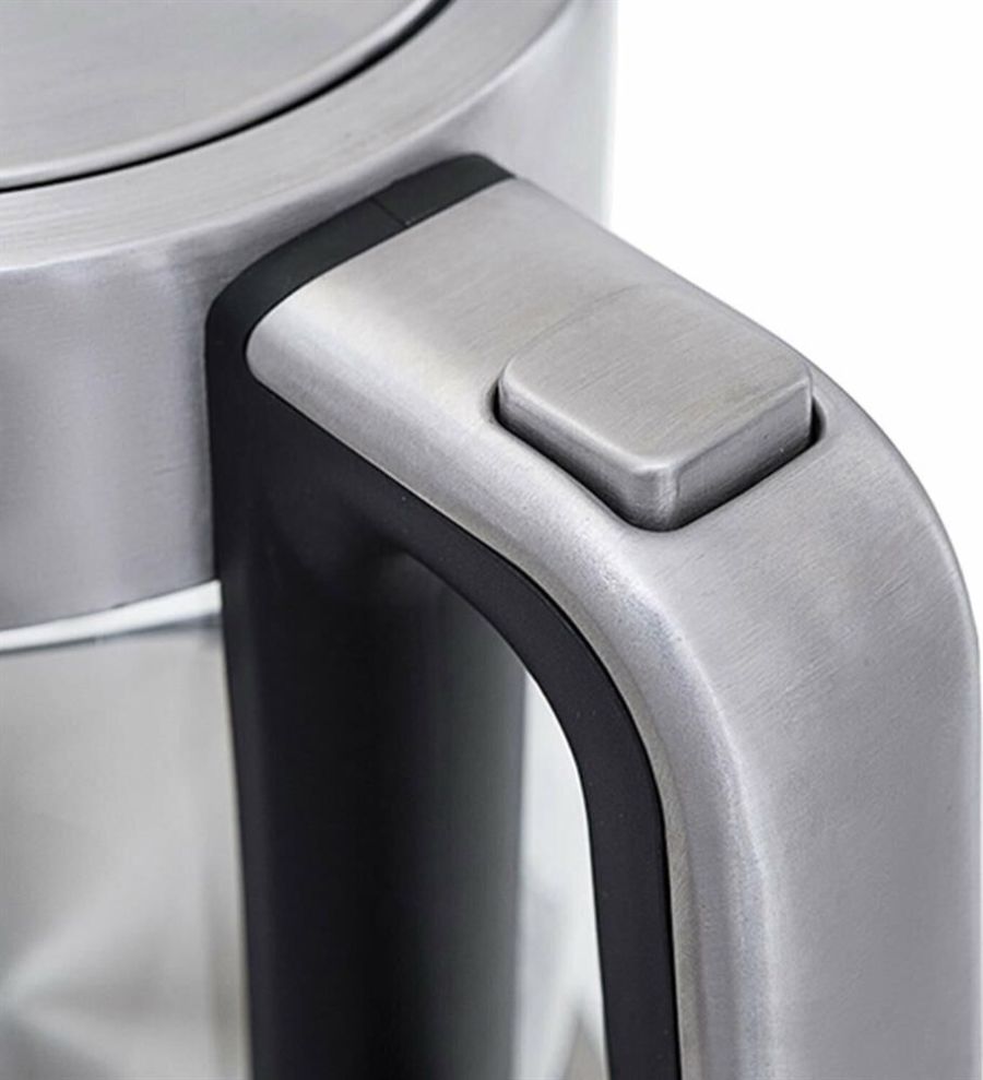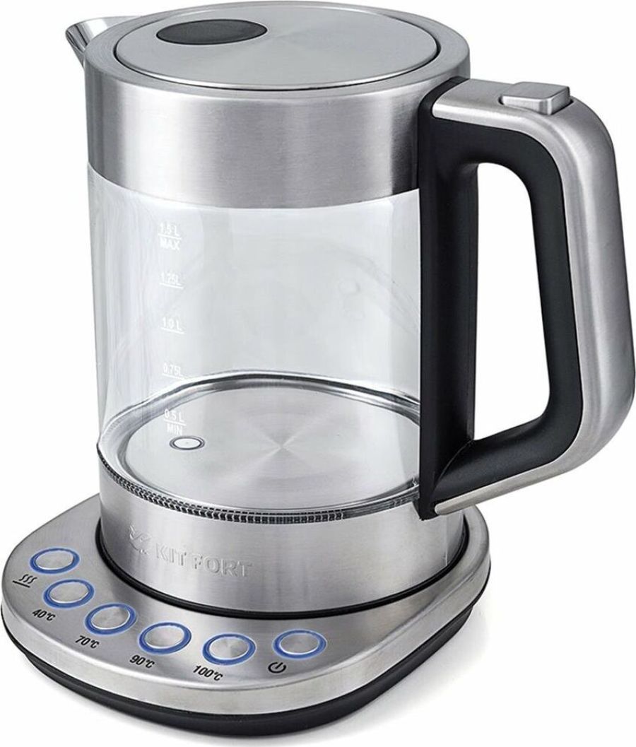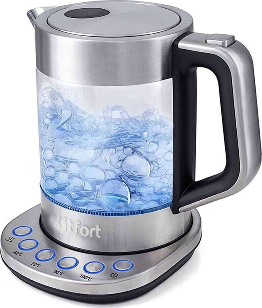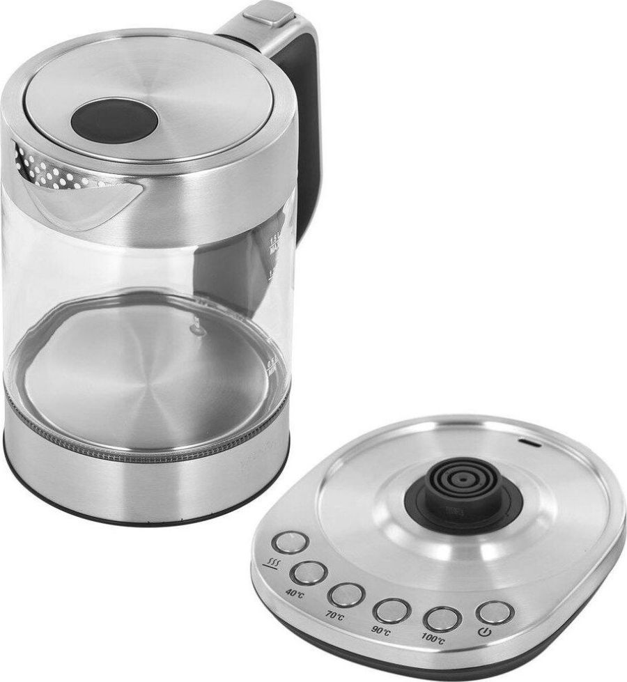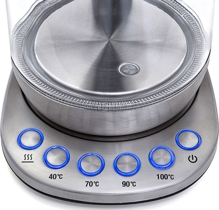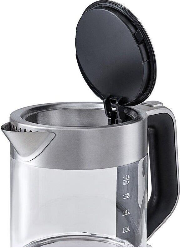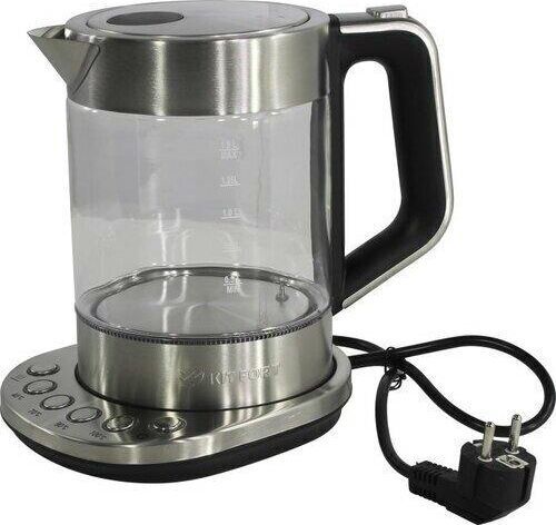 Мощность 2200 Вт. Максимальный объем 1.5 л. Нагревательный элемент скрытый. Индикатор включения есть. Индикатор уровня воды есть. Автоматическое отключение есть. Регулировка температуры нагрева есть. Температурные режимы 4 шт. Звуковой сигнал при закипании есть. Материал корпуса нержавеющая сталь/стекло. Цвет серебристый.