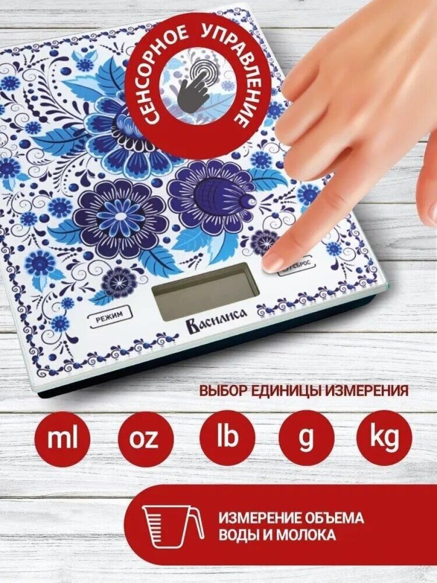 Предельная масса взвешивания 5 кг. Точность взвешивания ± 1 г. Размер весов 20х18х1,5см. Платформа из упрочненного стекла. LCD дисплей. Индикатор уровня заряда батареи и перегрузки весов. Функция измерения объема жидкости: молоко, вода. Функция сброса веса тары и обнуления позволяет последовательно взвешивать ингредиенты блюда, не учитывая массу посуды. Выбор единицы измерения. Автообнуление/автоотключение. Электропитание: 2х1,5 В батарея типа ААА (в комплекте).