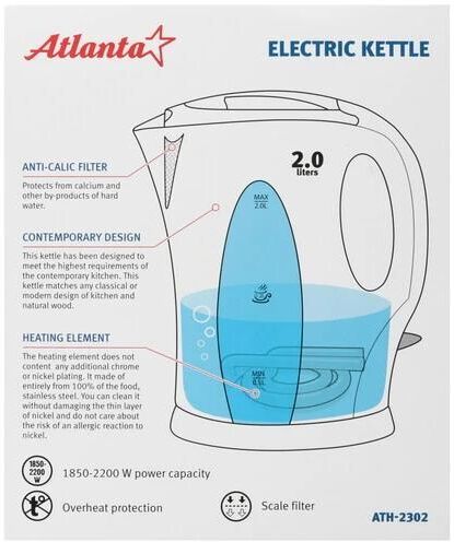 Мощность 2000 Вт. Объем 2,0 литра. Современный дизайн. Быстрое закипание. Фильтр от накипи. ТЭН из нержавеющей стали. Автоматическое отключение. Защита от перегрева без воды. Электрошнур в цокольной подставке.
