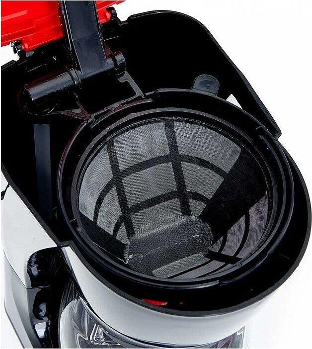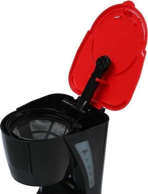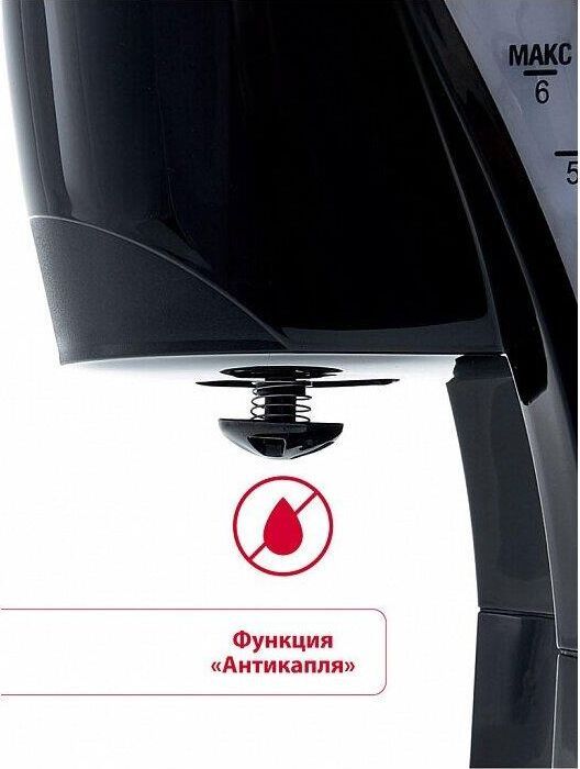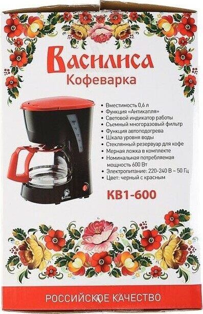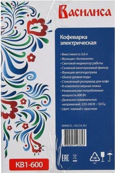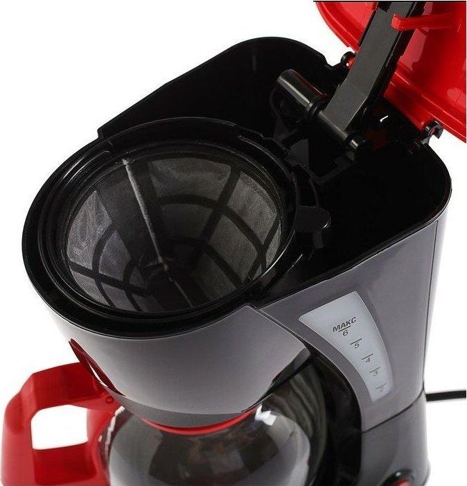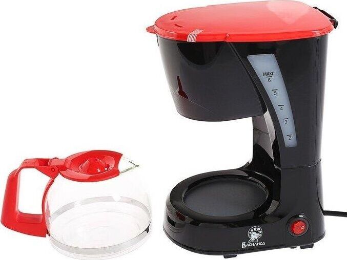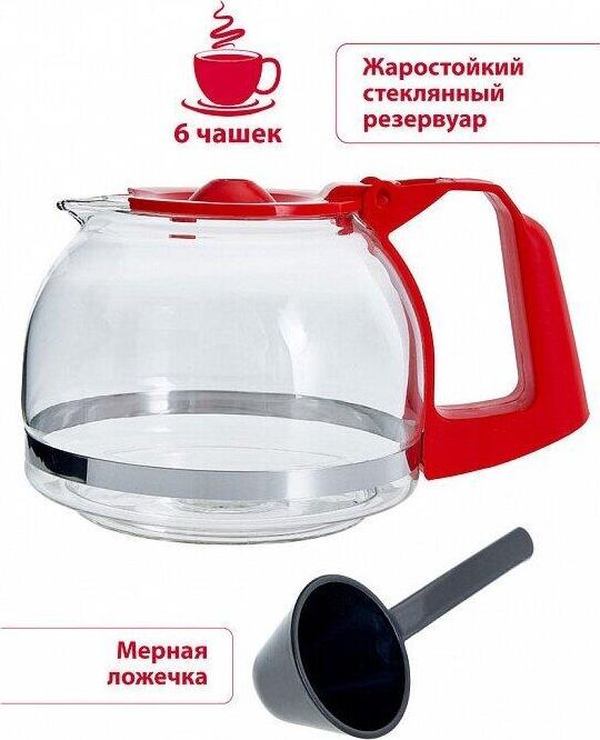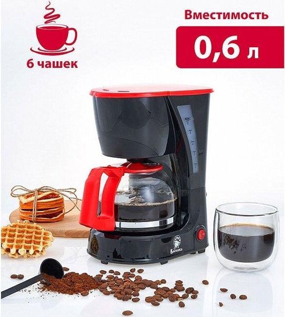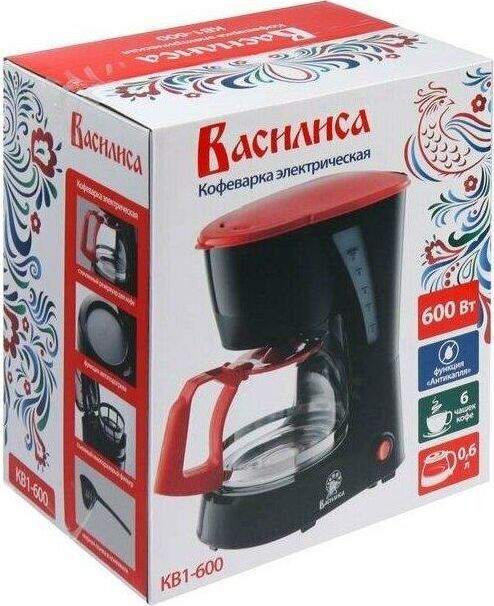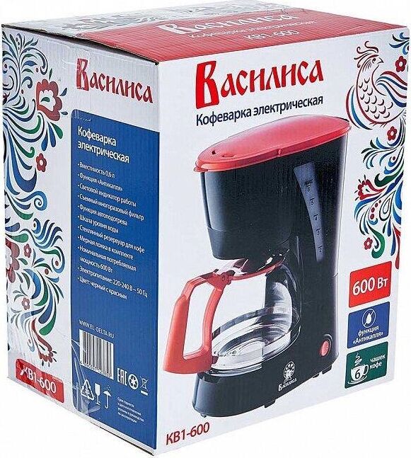 Мощность 600Вт. Вместимость 600мл. Корпус из высококач. пластика. Стеклянный резервуар для кофе. Съемный многоразовый фильтр. Световой индикатор работы. Шкала уровня воды. Система поддержания температуры. Функция «Антикапля». Функция увеличения крепости кофе. Противоскользящие ножки.