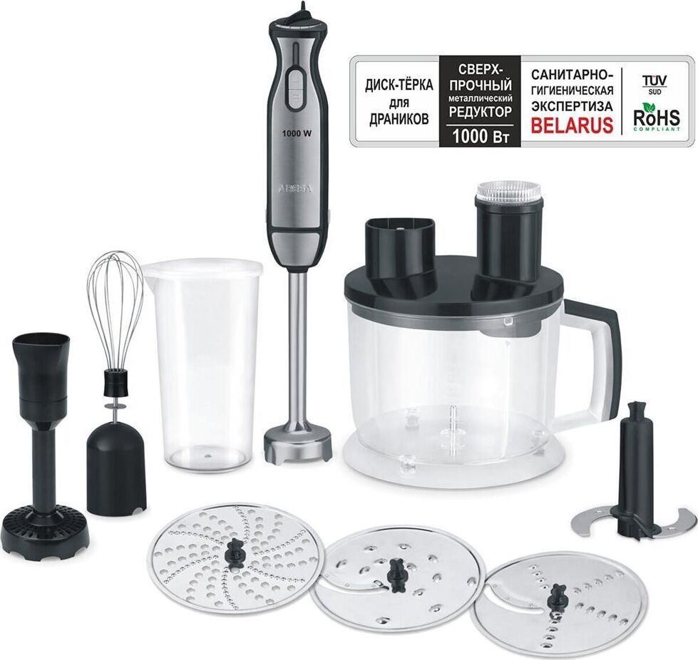 AR-1703 КОМПЛЕКТАЦИЯ: Чаша для измельчения (объём 1,75 л) Нож для измельчения Насадка-блендер Мерный стакан для смешивания (объём 0,6 л) с крышкой Венчик для взбивания Насадка для приготовления пюре Диск-тёрка для драников Двусторонний диск для тёрки и крупной нарезки Двусторонний диск для шинковки и мелкой нарезки Характеристики Мощность 1000 Вт Объем чаши 1.75 л Плавная регулировка оборотов Система защитной блокировки Режимы: Блендер; Измельчение; Нарезка; Шинковка; Смешивание; Взбивание; Терка Сверхпрочный металлический редуктор 4-лопастной нож Витой шнур