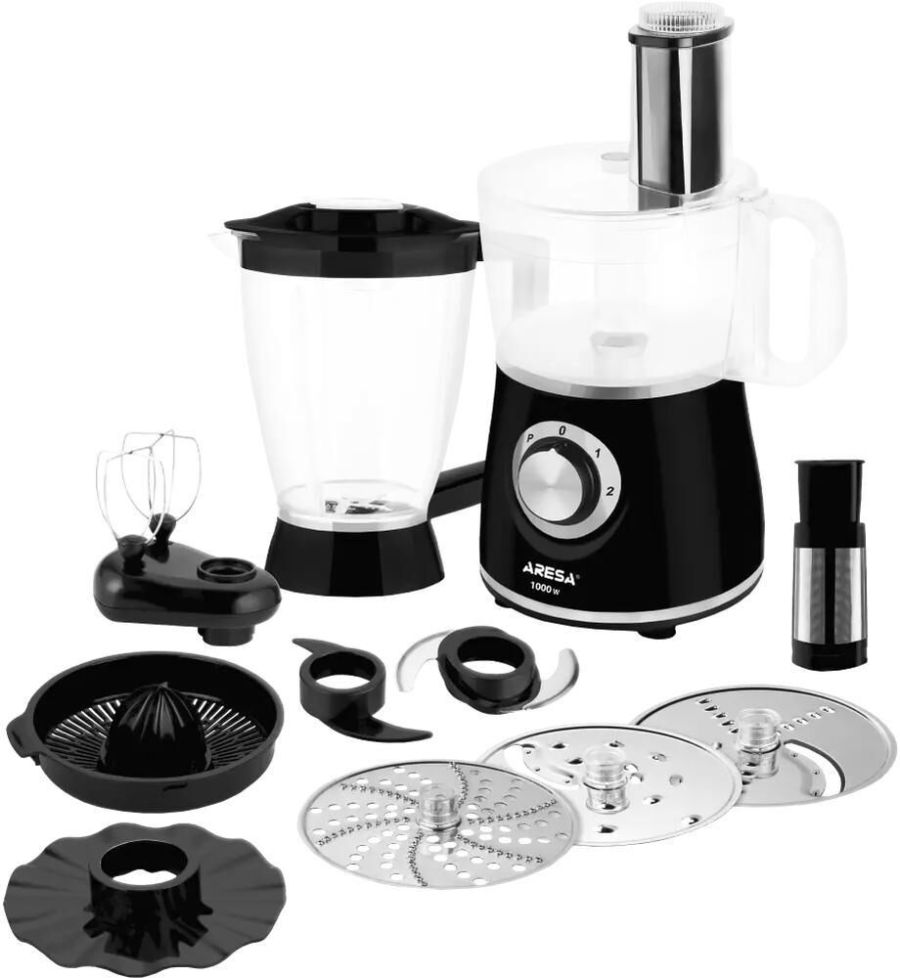 AR-1701 Чаша для измельчения Нож для измельчения Чаша блендера Венчик для взбивания Насадка для густого теста Диск для приготовления эмульсий Насадка для отжима сока из цитрусовых Фильтр для отжима сока из ягод Диск-тёрка для драников Двусторонний диск для тёрки и крупной нарезки Двусторонний диск для шинковки и мелкой нарезки Толкатель Характеристики Мощность: 750 Вт Объем чаши блендера: 1,75 л Объем чаши для измельчения: 1,2 л Режимы: Блендер, Измельчение, Нарезка, Шинковка, Смешивание, Взбивание, Терка