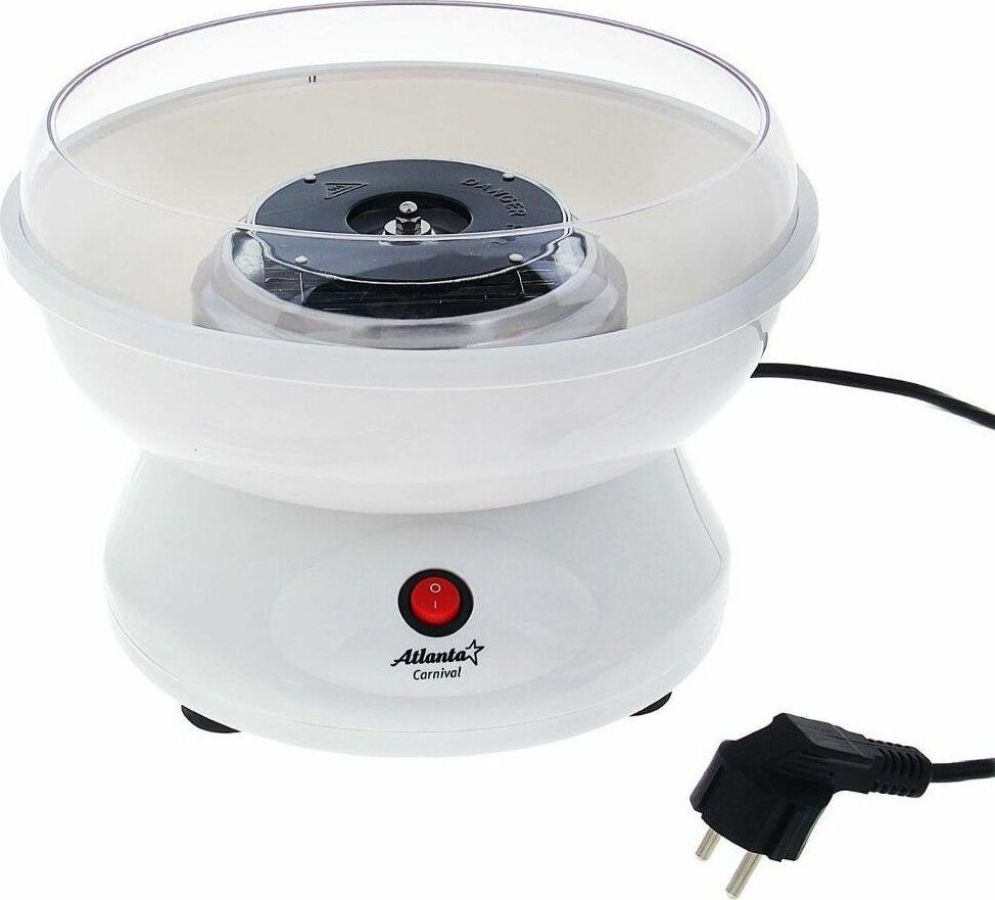 Мощность 500Вт. ATLANTA ATH-3421 аппарат для сахарной ваты. Вкусное лакомство из обычного сахара. Защитный экран для безопасного использования. Долговечный кварцевый нагревательный элемент.