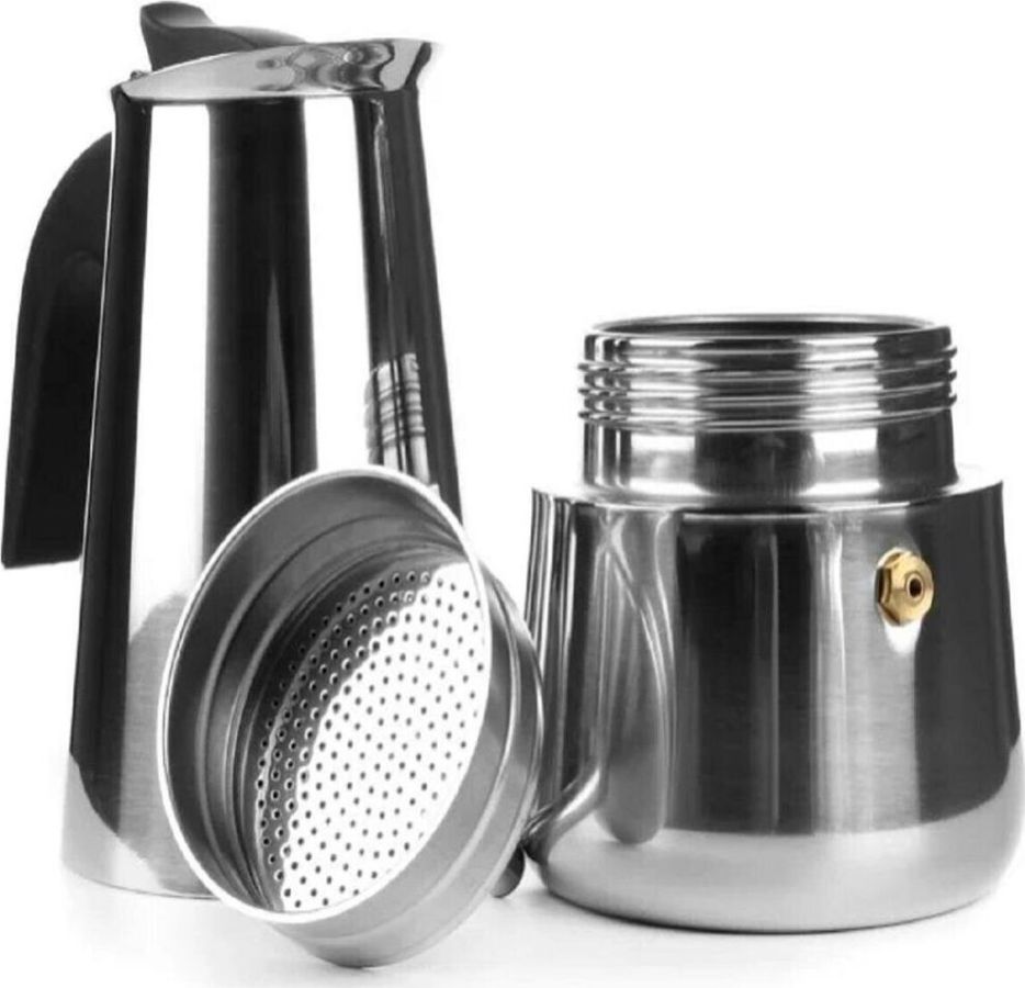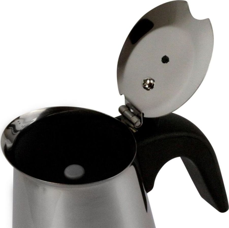 На 4 чашки. Нерж. сталь. Ручка и кнопка из нейлона (не нагреваются). Предохранительный клапан давления. Можно использ-ть на газ. плитах.Гейзер состоит из нижней емкости для воды, спец. сита-фильтра для кофе и верхнего чайничка для уже готового напитка.