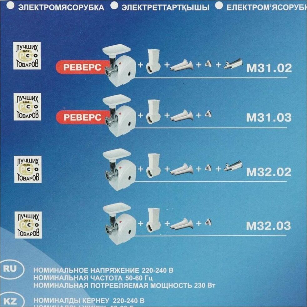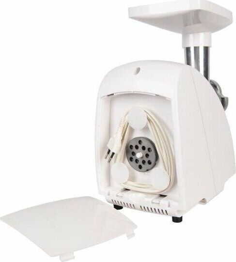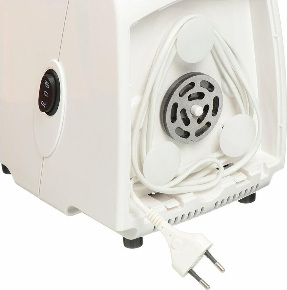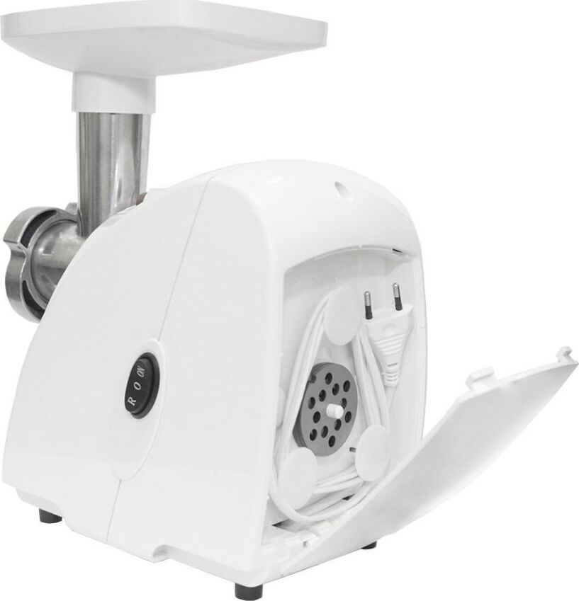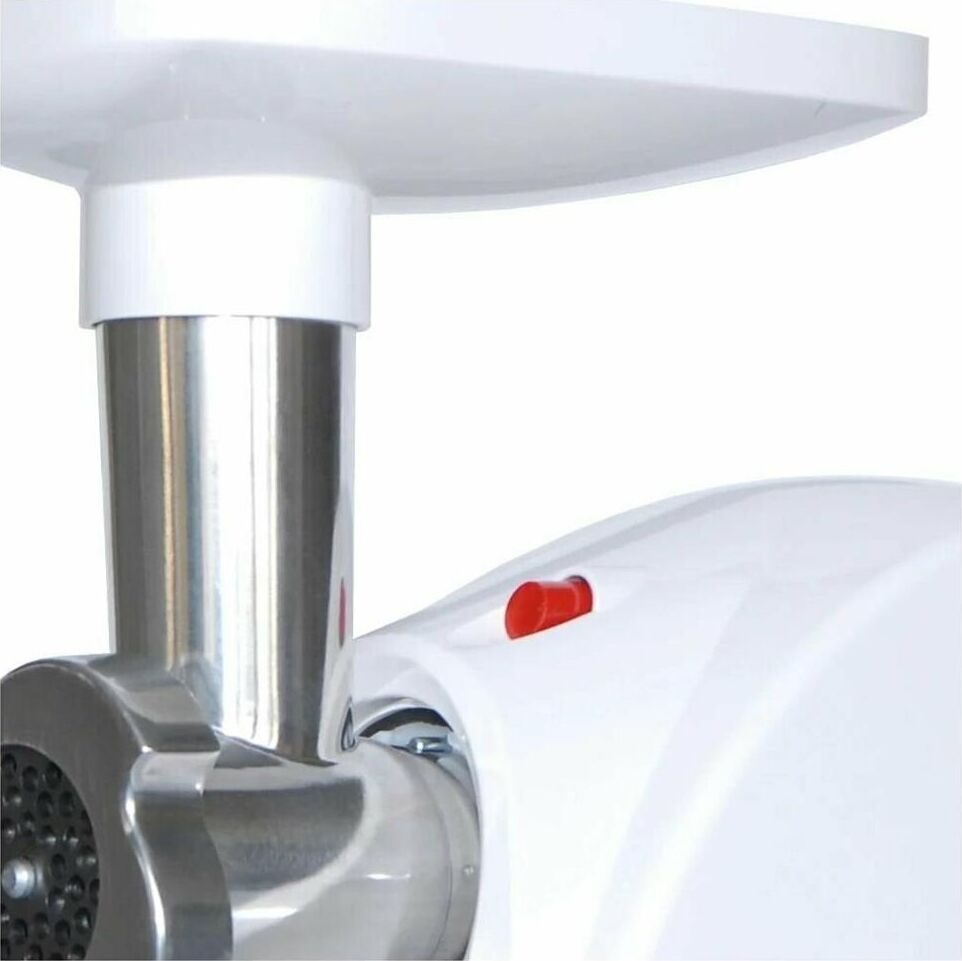 Макс. мощность 1500 Вт, номинальная мощность 230 Вт, производительность — до 100 кг/час, Защита двигателя от перегрузки; 3 вида решеток для получения фарша разной консистенции - с диаметром отверстий 4,9 мм и 7 мм, а также овальными отверстиями; Удобное хранение ножей и решеток; Высокое размещение шнековой камеры; Функция РЕВЕРС для предотвращения наматывания жилок на шнек; Устойчивые нескользящие ножки для фиксации мясорубки на поверхности стола.