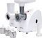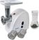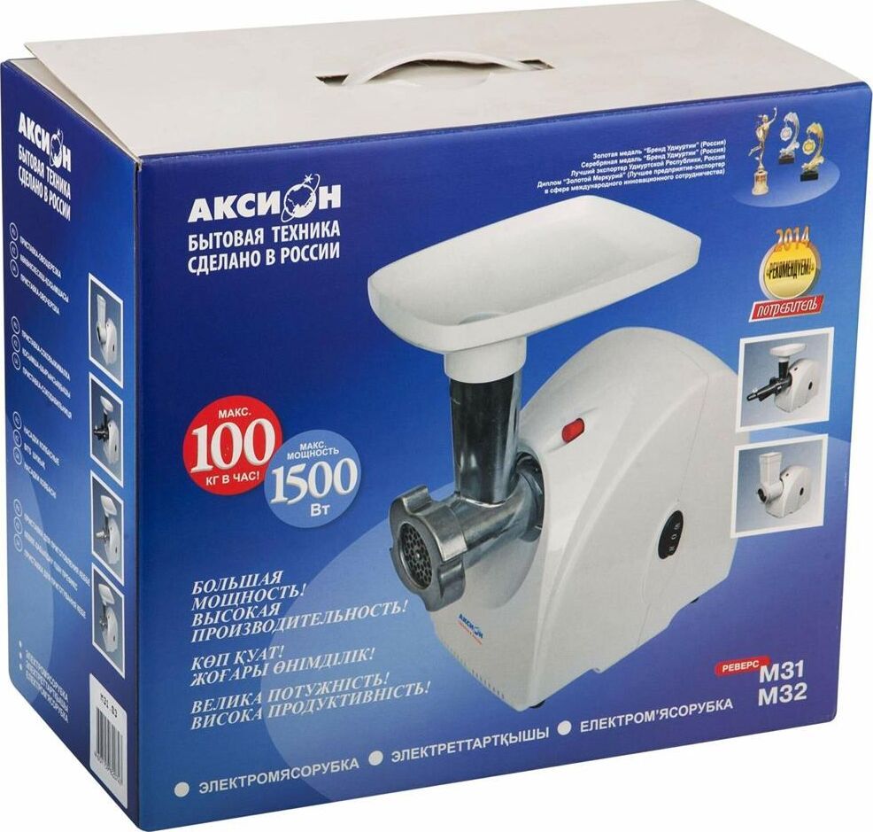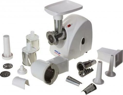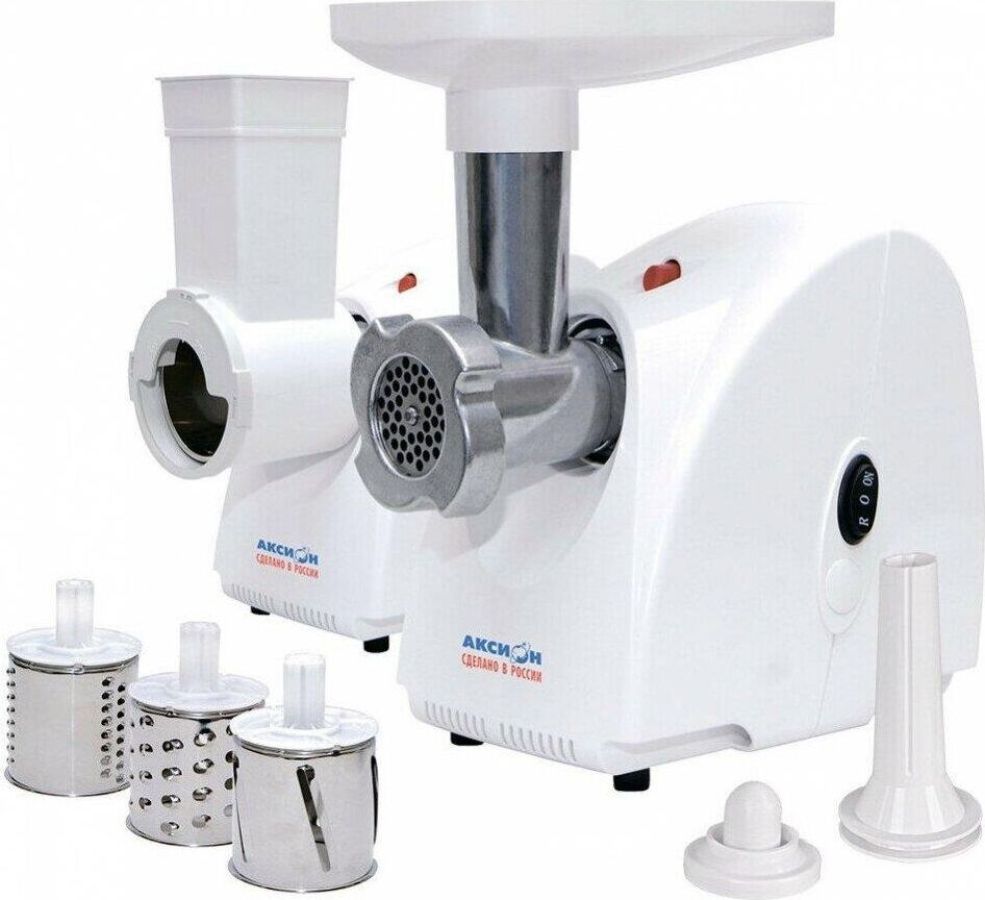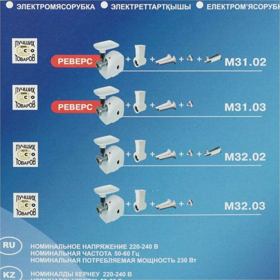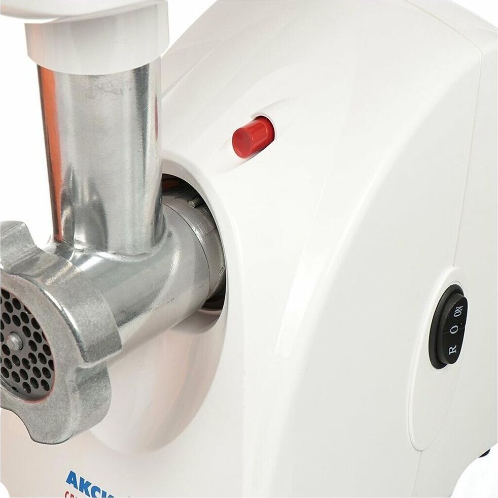 Макс. мощность 1500 Вт, номинальная мощность 230 Вт, производительность — до 100 кг/час, Защита двигателя от перегрузки; 3 вида решеток для получения фарша разной консистенции - с диаметром отверстий 4,9 мм и 7 мм, а также овальными отверстиями; Удобное хранение ножей и решеток; Высокое размещение шнековой камеры; Функция РЕВЕРС для предотвращения наматывания жилок на шнек; Устойчивые нескользящие ножки для фиксации мясорубки на поверхности стола.