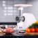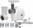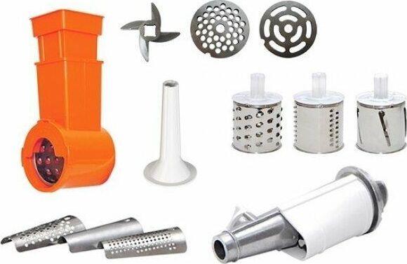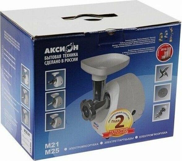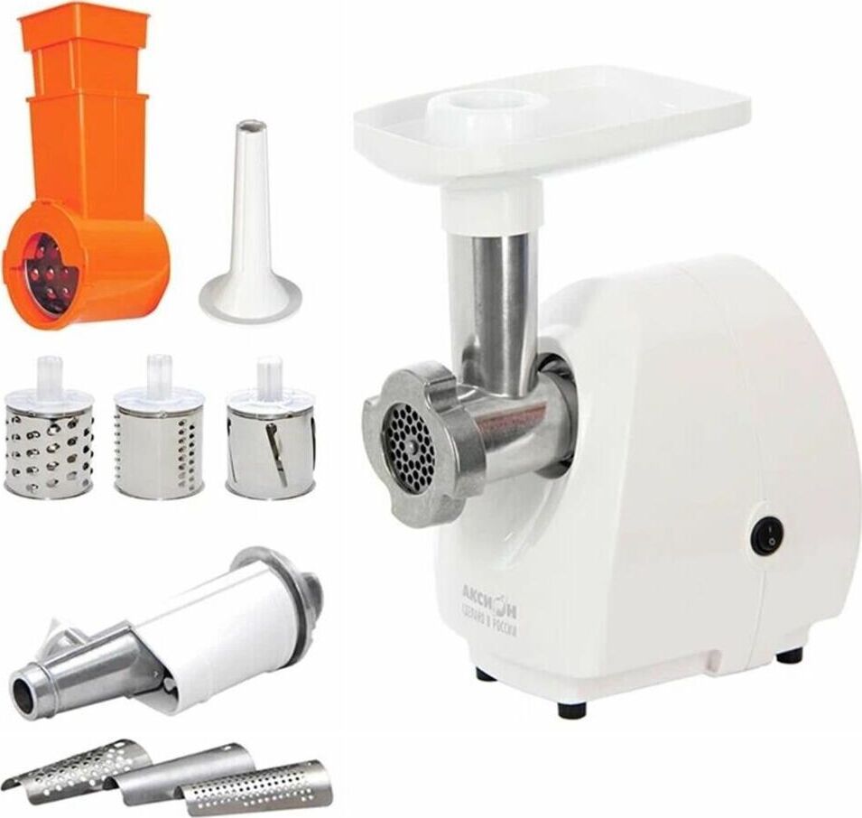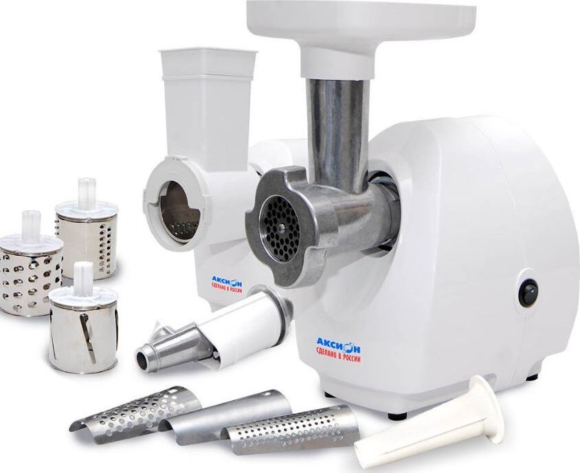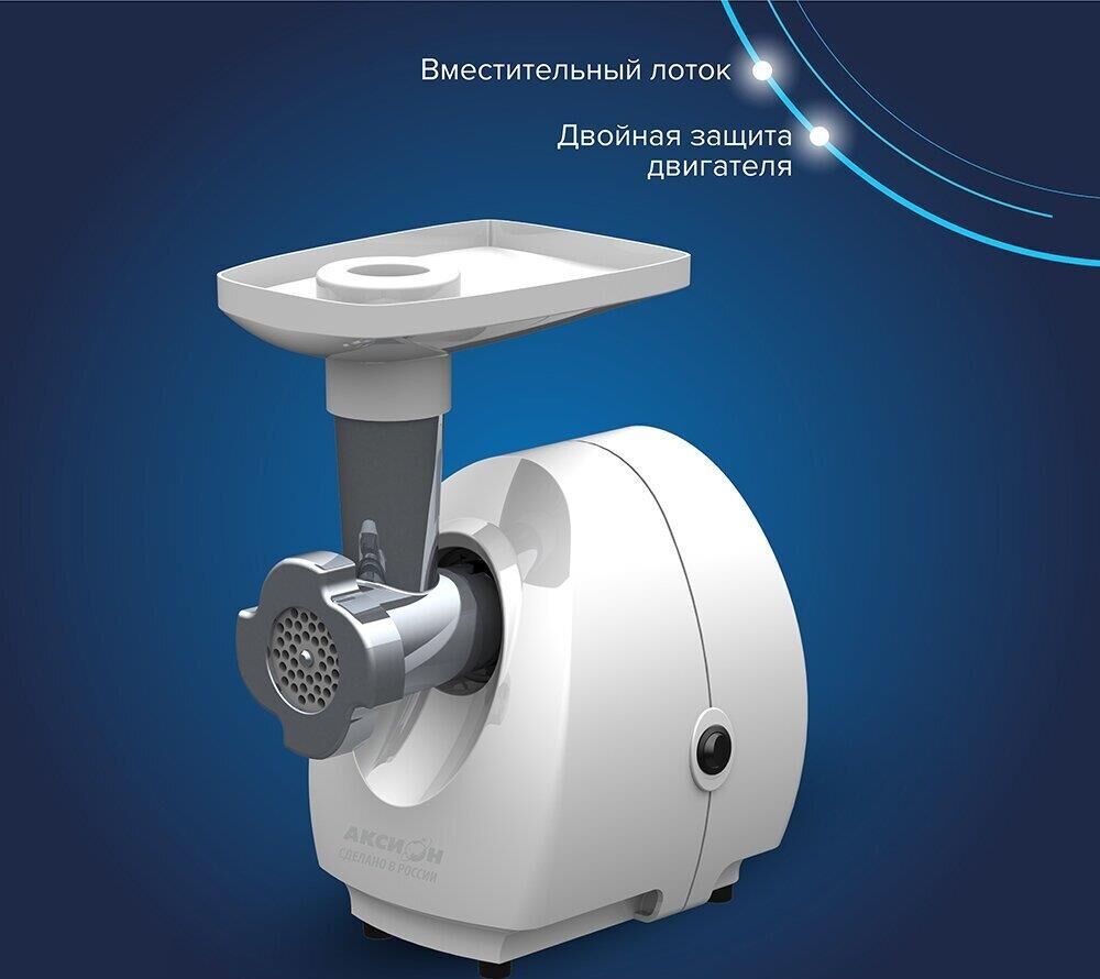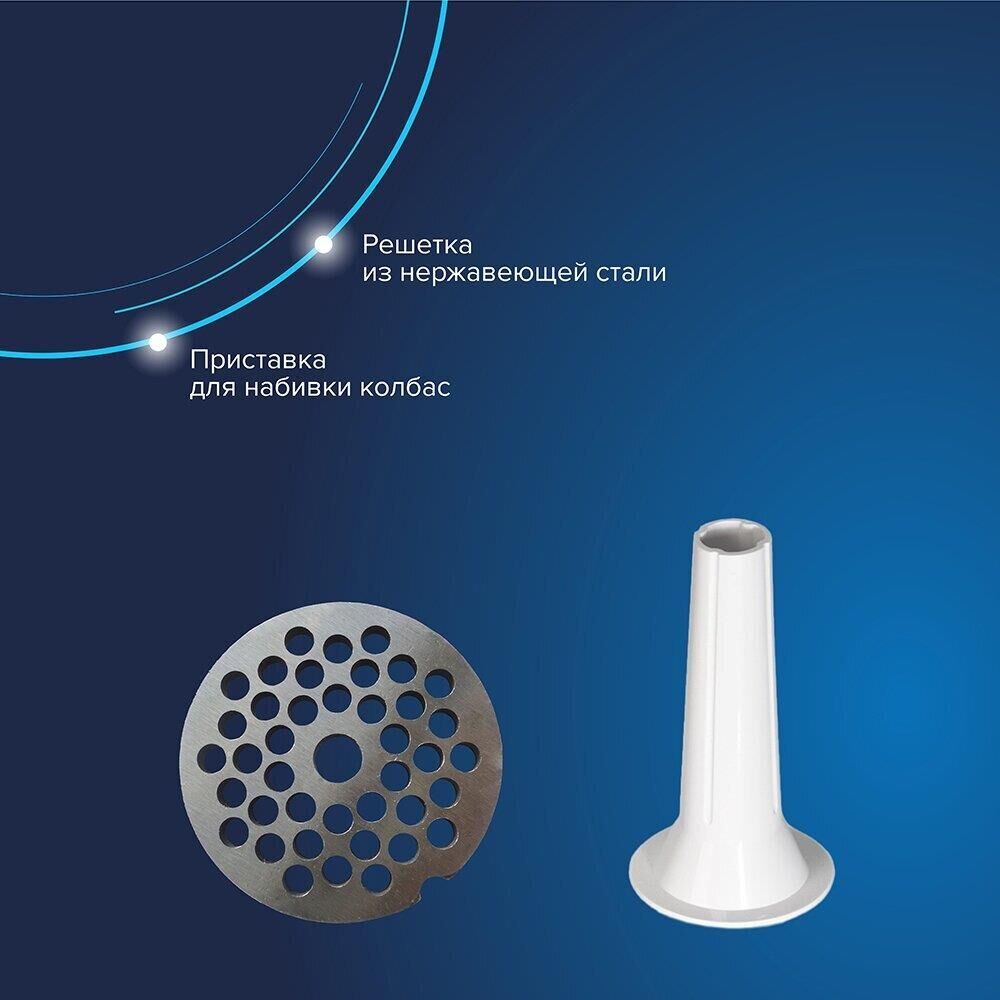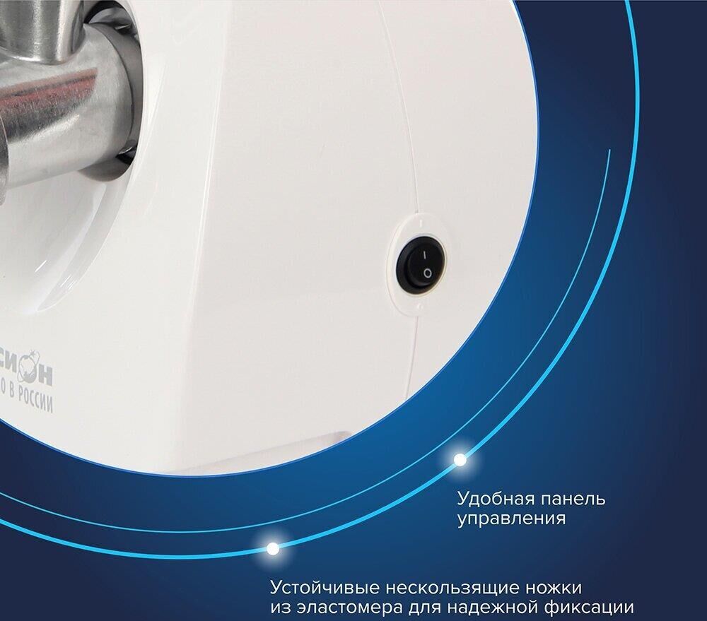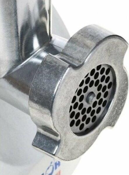 максимальная мощность 1500 Вт, номинальная мощность 230 Вт, производительность — 50 кг/час, комплектуется приставкой — овощерезкой с тремя сменными барабанами и приставкой соковыжималкой. Отсек для хранения шнура питания; Защита двигателя от перегрузки; 2 вида решеток для получения фарша разной консистенции - с диаметром отверстий 4,9 мм и продолговатыми; Высокое размещение шнековой камеры; Устойчивые нескользящие ножки для фиксации мясорубки на поверхности стола
