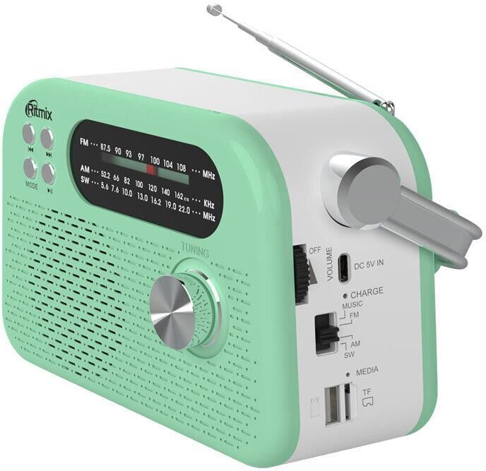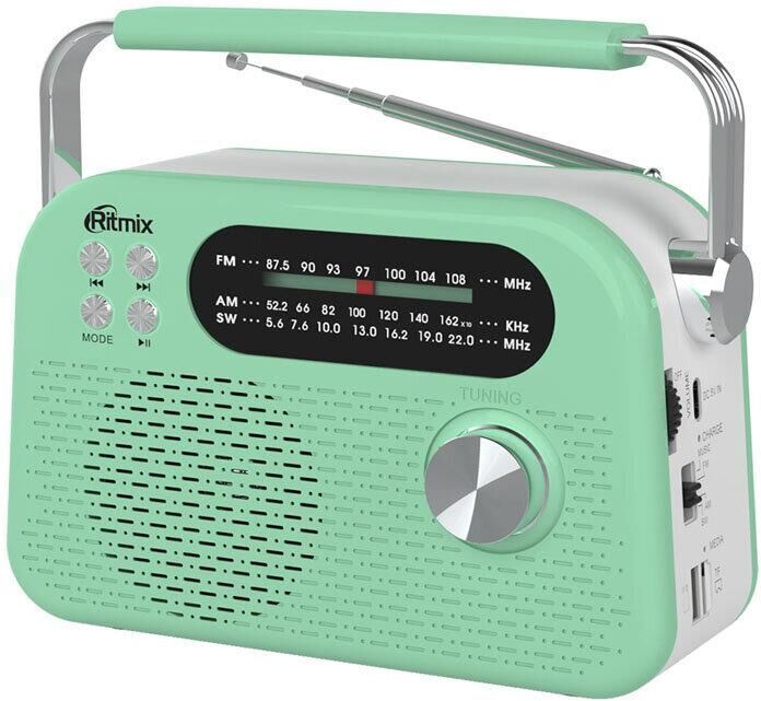 Портативный трёхдиапазонный радиоприёмник с ручкой для переноски. Поддержка Bluetooth v.5.4 и режима MP3, воспроизведение с USB/micro SD карт, питание USB Type-C, сменный аккумулятор на 1200 мАч