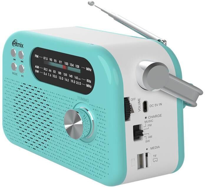 Портативный трёхдиапазонный радиоприёмник с ручкой для переноски. Поддержка Bluetooth v.5.4 и режима MP3, воспроизведение с USB/micro SD карт, питание USB Type-C, сменный аккумулятор на 1200 мАч