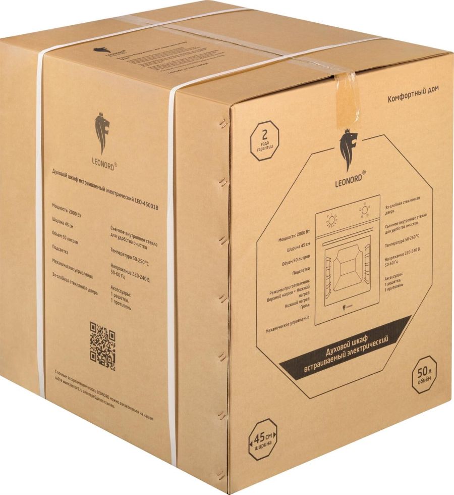 Мощность 2000 Вт Ширина 45 см Объем 50 литров Механическое управление 3 режима приготовления -Верхний нагрев + Нижний нагрев -Нижний нагрев -Двойной гриль 3х-слойная стеклянная дверь Cъемное внутреннее стекло для удобства очистки Хромированные направляющие Подсветка Максимальная температура 250 °С Длина шнура 120 см Аксессуары: 1 решетка, 1 противень Напряжение 220-240 В, 50-60 Гц Гарантия 2 года