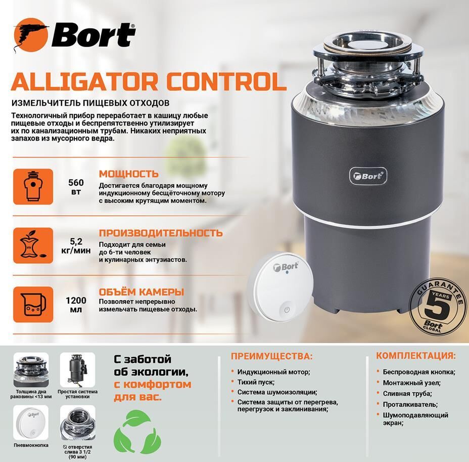 Назначение: бытовой Число ступеней измельчения: 3 Функция авто-реверса: Да Усилитель мощности (бустер): Нет Система шумоизоляции: полная Мощность, Вт: 560 Объем камеры, мл: 1 200 Материал корпуса камеры: Нержавеющая сталь Материал измельчающего элемента: Нержавеющая сталь Тихий запуск: Да Система защиты от перегрузки и заклинивания: Да Скорость холостого хода, об/мин: 1 450 Вес изделия, кг: 8,5 Напряжение сети, В: 220 Частота тока, Гц: 50 Тип мотора: индукционный Мощность л.с.: 0,75 Производительность, кг/мин: 5,2 диаметр сливного отверстия: 3 1/2 (90мм) Толщина дна раковины, мм: 1...14 Уровень шума, дБ: 52 Автоматическое выключение: Да Длина шнура питания, м: 1 Бесшумная работа: Да Размер, мм: 350х210 Способ загрузки: непрерывный Подключение к посудомоечной машине: Да Возможность подключения беспроводной кнопки: Да Управление измельчителем: Электронное Тип соединения устройств, тип: Беспроводное Подходит для семьи, чел: до 8 Плавный пуск: Да