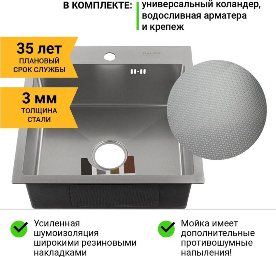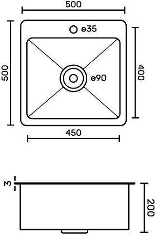 Мойка врезная, матовая, большой сифон с переливом. Сифон с углубленной горловиной, мусоросборником и крышкой. Врезная кухонная мойка произведена из премиальной нержавеющей стали AISI 304, обладает повышенной прочностью. Особенность мойки заключается в конструкции ее дна, имеющего небольшой уклон. Благодаря такой особенности, вода быстрее уходит в слив, не застаивается, что способствует поддержанию гигиеничности в чаше. Скругленные внутренние углы облегчают уход за мойкой, препятствуют скоплению частичек грязи.Тихой в использовании мойку делает шумоизолирующее покрытие и накладки с обратной стороны мойки. В комплект входит универсальная раздвижная корзина, коврик, сифон, мойка, крепёж. Габаритные размеры: ширина 500 мм, длина 500 мм, глубина 200 мм, толщина основания 3,0 мм, чаша 0,8 мм. Вес - 8,000 кг, объём - 0,07000 м3.