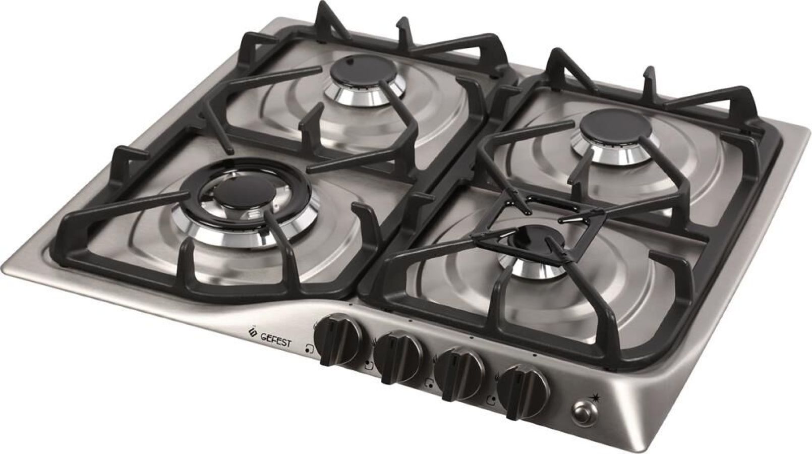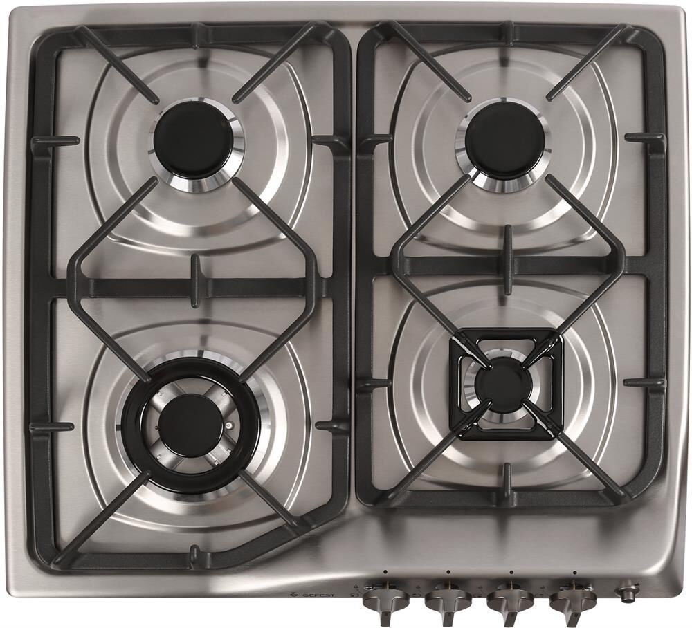 Габаритные размеры ШхГхВ: 59х52х8.5 см * Варочная поверхность: нержавеющая сталь * Газ-контроль горелок стола * Чугунные решетки горелок стола * Фиксированное положение «малое пламя» * Электророзжиг горелок, кнопка розжига на панели *
