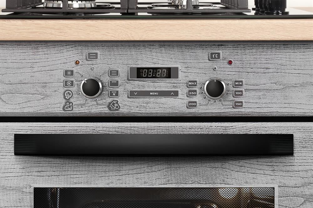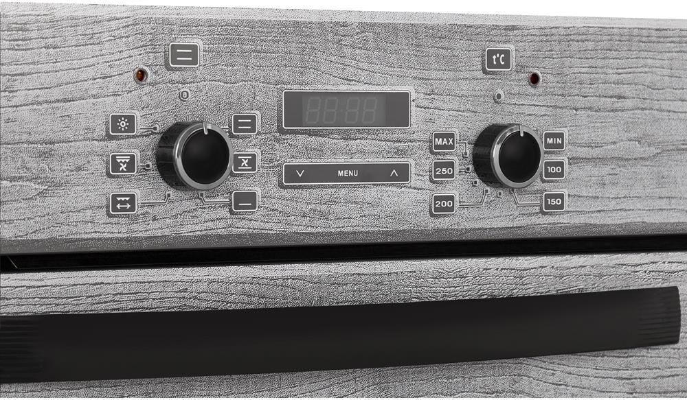 Духовой шкаф. Цвет: серый с рисунком "дерево". Габаритные размеры ШхГхВ: 59.8х56.5х59.5 см. Объём духовки: 55 л. Гриль электрический. Таймер сенсорный. Подсветка духовки двойная. Телескопические направляющие. Съемные проволочные направляющие духовки. Усиленный гриль с конвекцией. Класс электробезопасности: I.