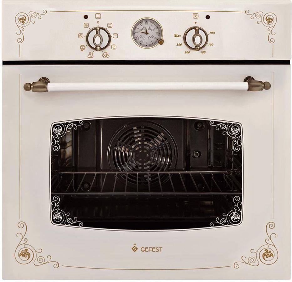 Духовой шкаф. Цвет: кремовый с рисунком "ретро". Габаритные размеры ШхГхВ: 59.8х56.5х59.5 см. Объём духовки: 55 л. Гриль электрический. Таймер аналоговый. Подсветка духовки двойная. Усиленный гриль с конвекцией. Съемные проволочные направляющие духовки. Масса нетто, 33,1кг. Диапазон номинальных напряжений, В: 220-230. Фасад: эмалированный. Сетевой шнур и вилка: в наличии. Класс электробезопасности: I.