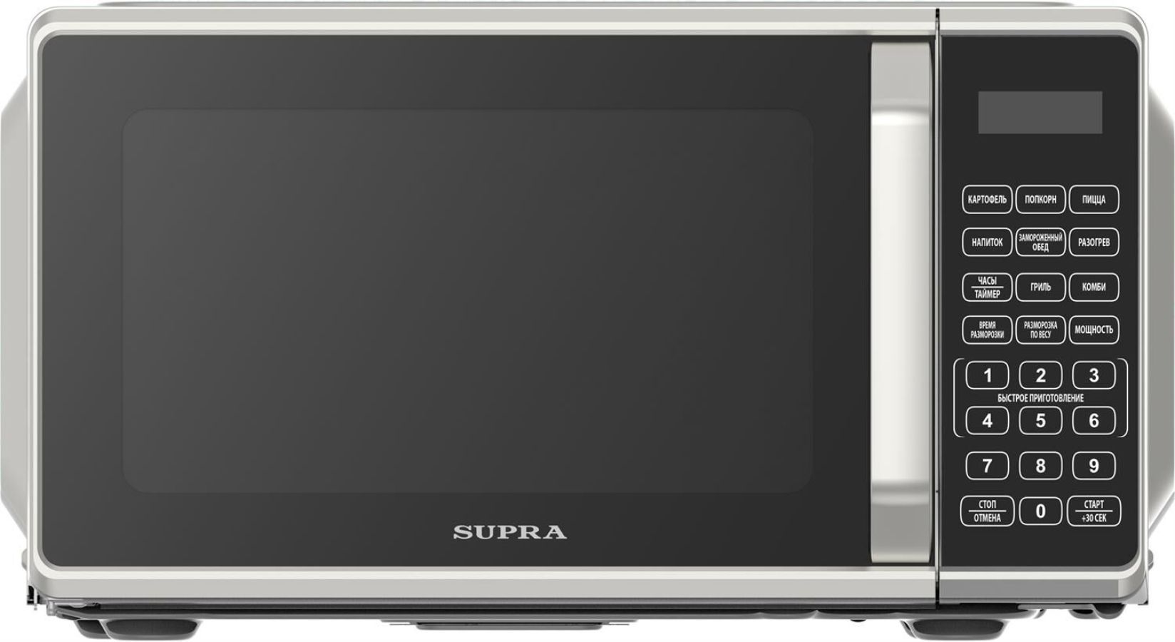 Микроволновая печь, внутренний объем: 20 литров, выходная мощность: 700 Вт, входная мощность: 1100 Вт, мощность гриля: 900 Вт, тип управления: цифровой, электронные часы, диаметр поворотного стола: 245 мм, количество уровней мощности: 10, программы автоматического приготовления: 6, размораживание по весу и времени, таймер: до 99мин.99 сек., блокировка от детей, тип открывания дверцы: ручка, сигнал окончания приготовления