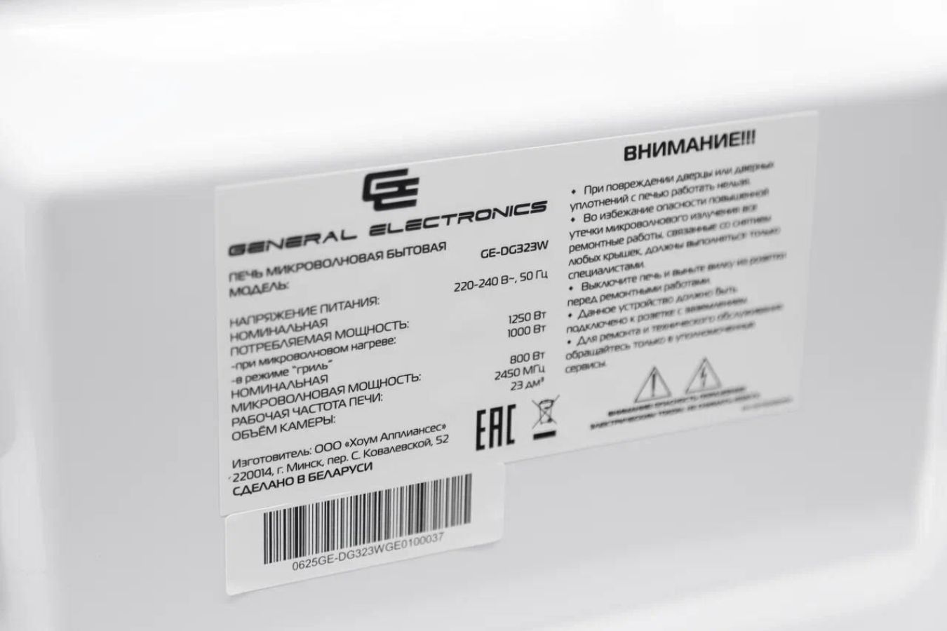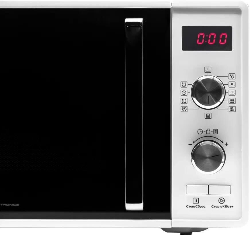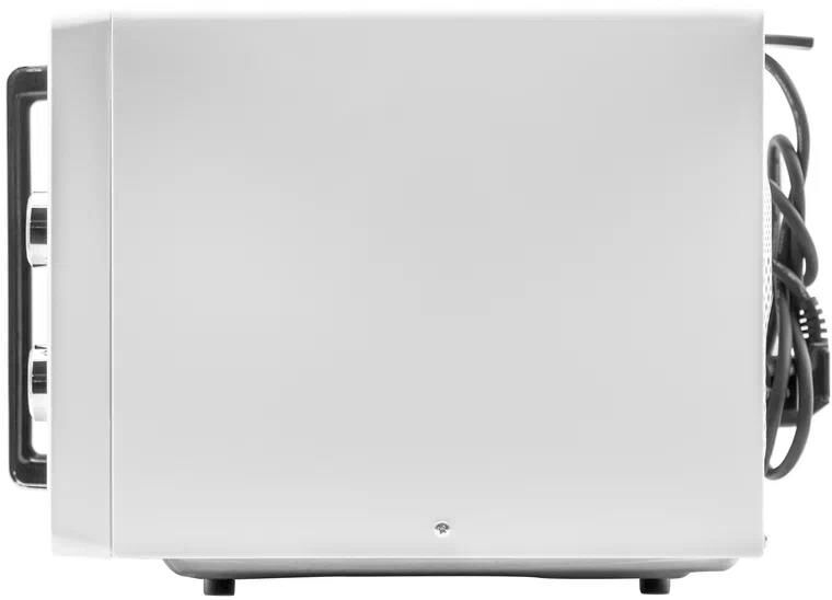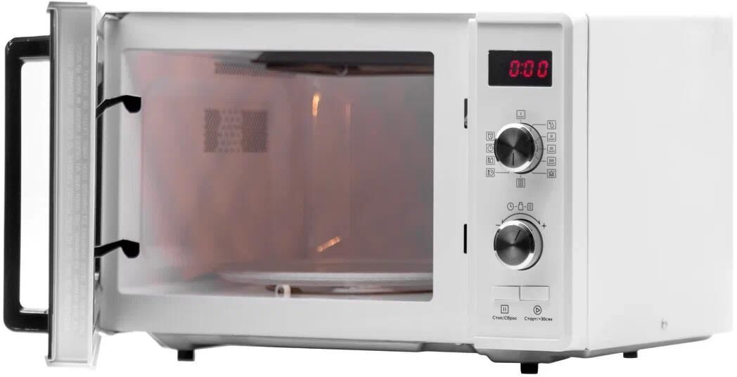 23 Литра, цвет - белый, мощность 800W, 6 автопрограмм, 11 режимов мощности, гриль - 1000Вт, функция разморозки по весу, быстрый старт, таймер. Сенсорное управление. Потребляемая мощность микроволновой печи (Вт) - 1250. Частота - 2450 MHz. Внутренний размер (ВхШхГ) (мм) - 314*347*201, размер коробки - 536*436*330. Вес (n/g) - 14,5кг