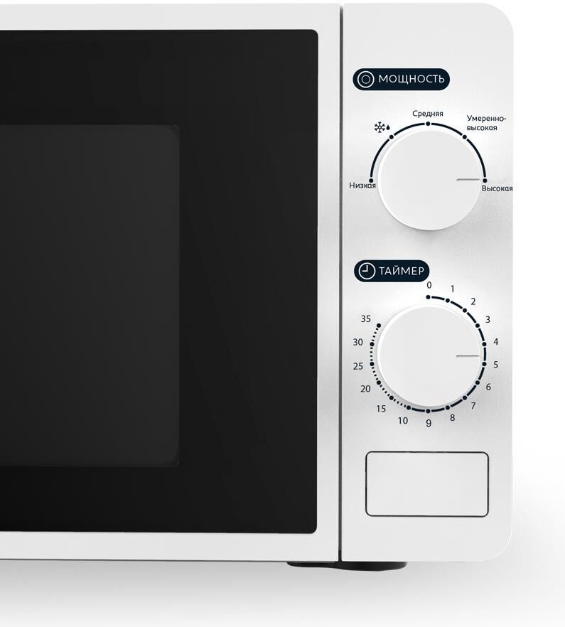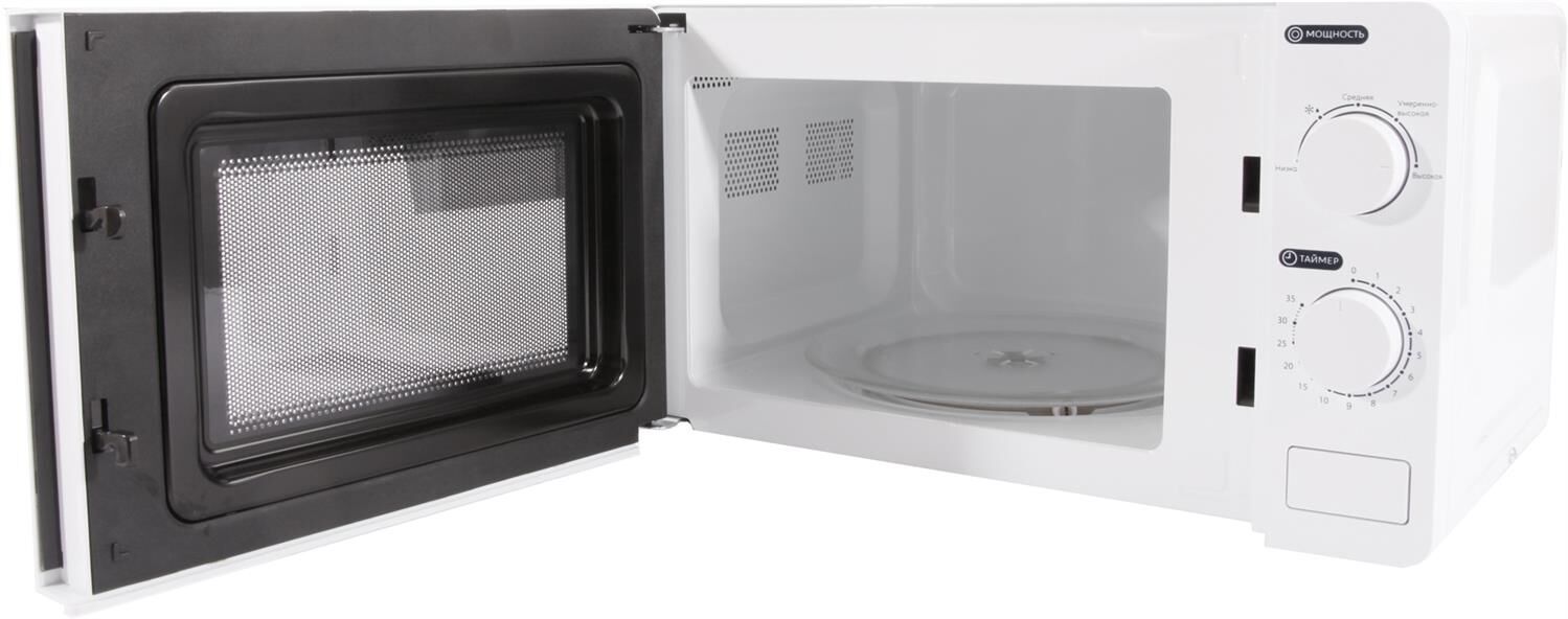 Микроволновая печь, внутренний объем: 20 литров, выходная мощность печи: 700 Вт, тип управления: механический, диаметр поворотного стола: 245 мм, количество уровней мощности: 5, автоматическое размораживание, таймер: 35 минут, тип открывания дверцы: кнопка, сигнал окончания приготовления, цвет: белый