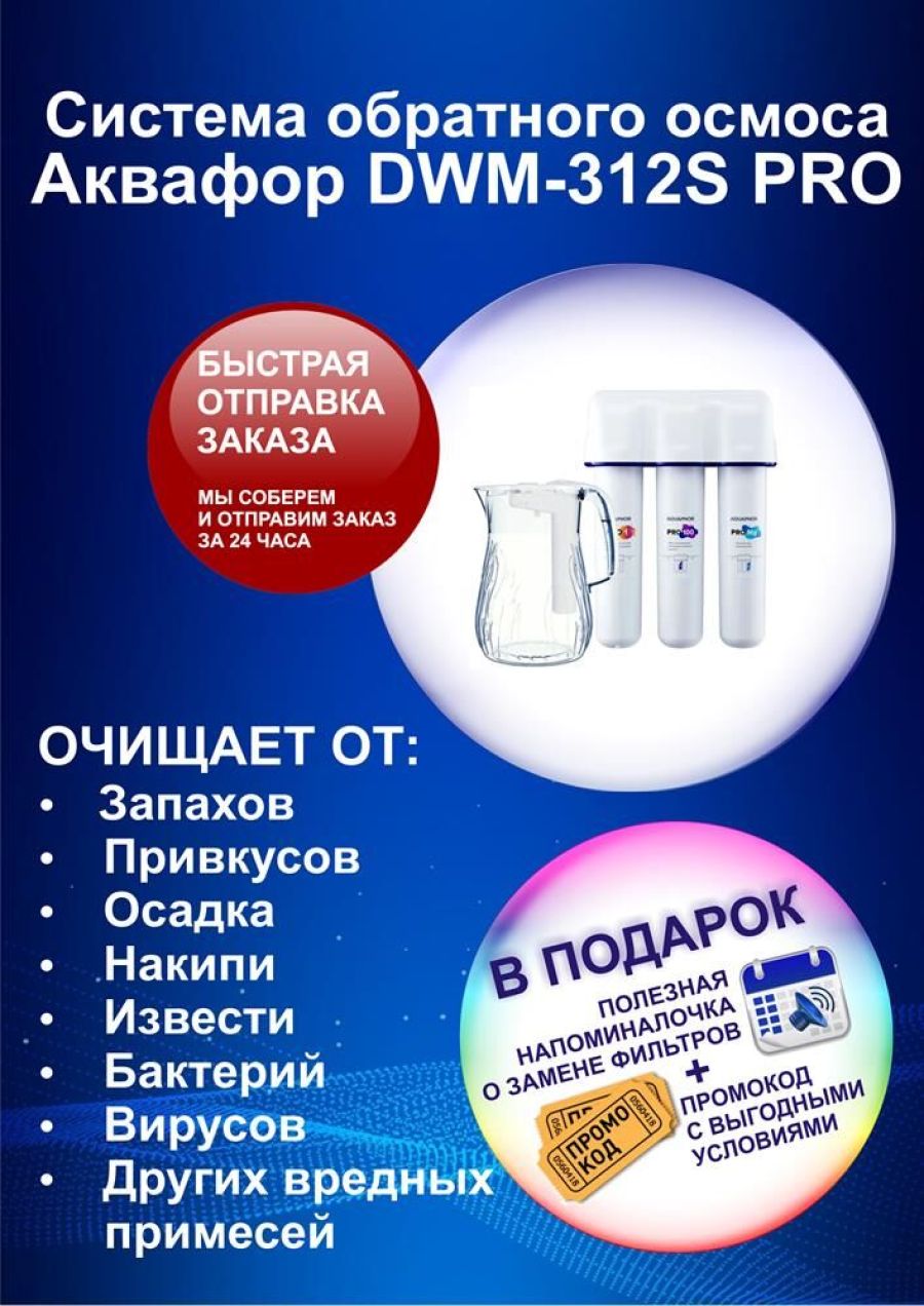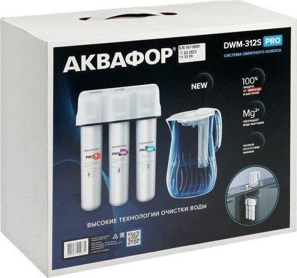 Система DWM-312S PRO — высокопроизводительный обратный осмос в небольшом корпусе. Абсолютное умягчение воды и максимальная степень удаления растворенных примесей, а также вирусов, бактерий и цист без химических бактерицидов. Давление в водопроводе не менее 1,5 атм. Давление в водопроводе не более 6,5 атм. Вода холодная. Масса 5,0 кг. Накопительная емкость внешняя кувшинного типа. Оптимизирует минеральный состав. Защита от бактерий. Сразу несколько инноваций позволили увеличить ресурс глубокой очистки сорбционного картриджа PRO 1. Он защищает мембрану от хлора и грубых примесей, чтобы продлить ресурс её тонкой очистки. Модуль справляется с мутной водой и с повышенным содержанием железа, включая Fe2+ и Fe3+.