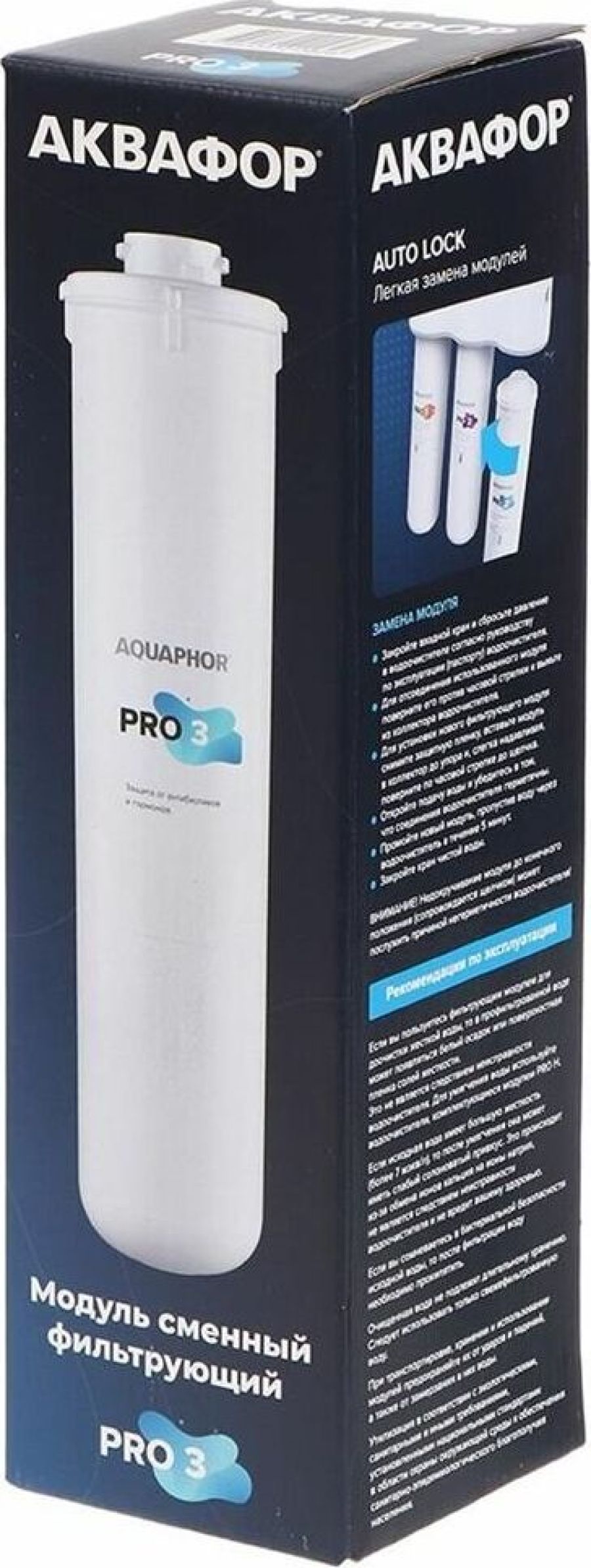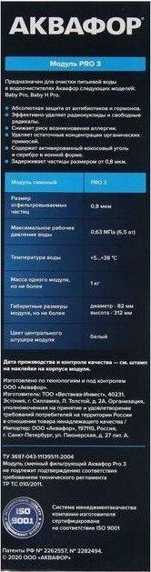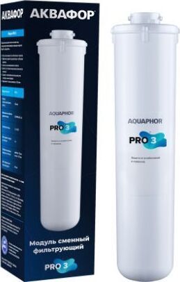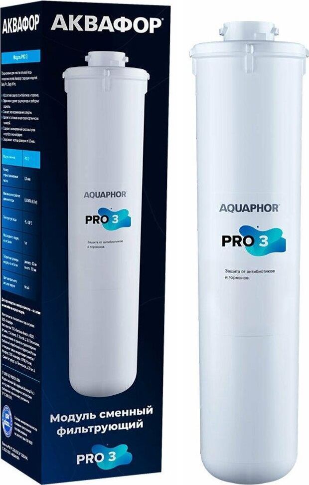 Модуль Pro 3 удаляет из воды остаточные концентрации химических примесей, включая антибиотики, гормоны и свободные радикалы. Карбонблок с ионообменным волокном АКВАЛЕН не пропускает частицы размером от 0,8 микрон, обеспечивая финишную сорбционную очистку в системах АКВАФОР Baby Pro. Абсолютная защита от следовых количеств обезболивающих, антибиотиков, гормонов и других химических загрязнений обеспечивается сочетанием запатентованных технологий АКВАФОР и уникальными сорбционными средами. Система Аквафор Baby Pro с модулем Pro 3 удаляет остаточные количества популярных лекарств на примере антибиотика Левомицетина и стероидного гормона Эстрона с результатом фильтрации 99,9% и 99.8% соответственно.