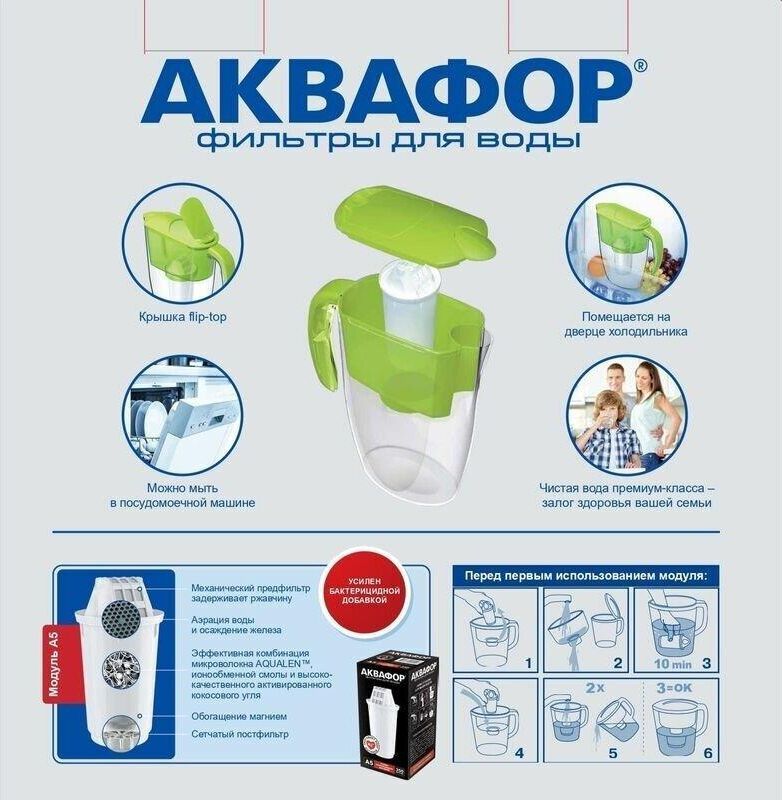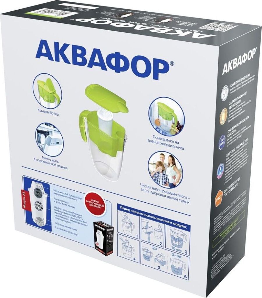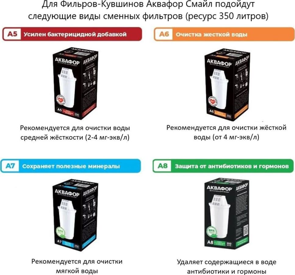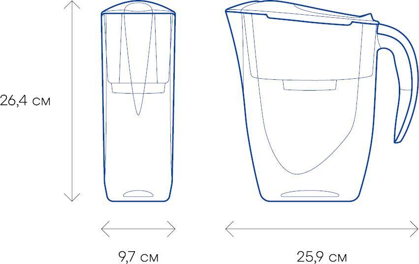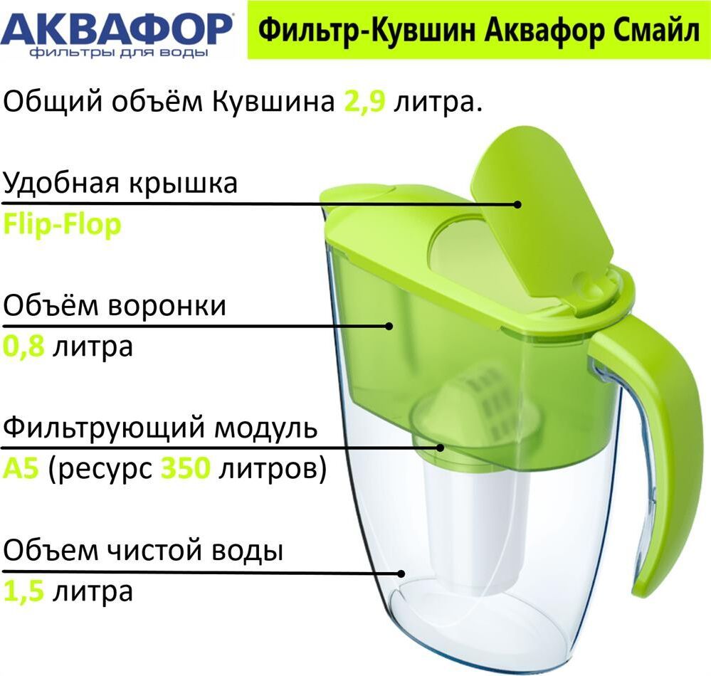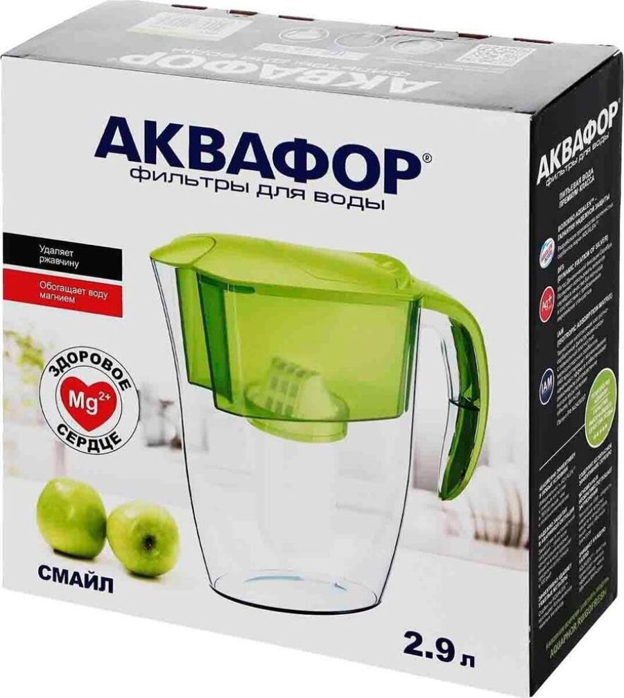 Очищает воду там, где вам нужно * Очень прост в использовании * Все детали выполнены из качественного пищевого пластика * Ресурс: 350 л * Скорость фильтрации: 0.2 л/мин * Объем кувшина / воронки: 2,4 / 1 л * Габариты: 26,7x10,2x26,7 см * Смайл очищает воду от: активного хлора, органических веществ, свинца, тяжелых металлов, коллоидного железа