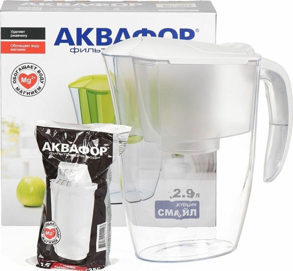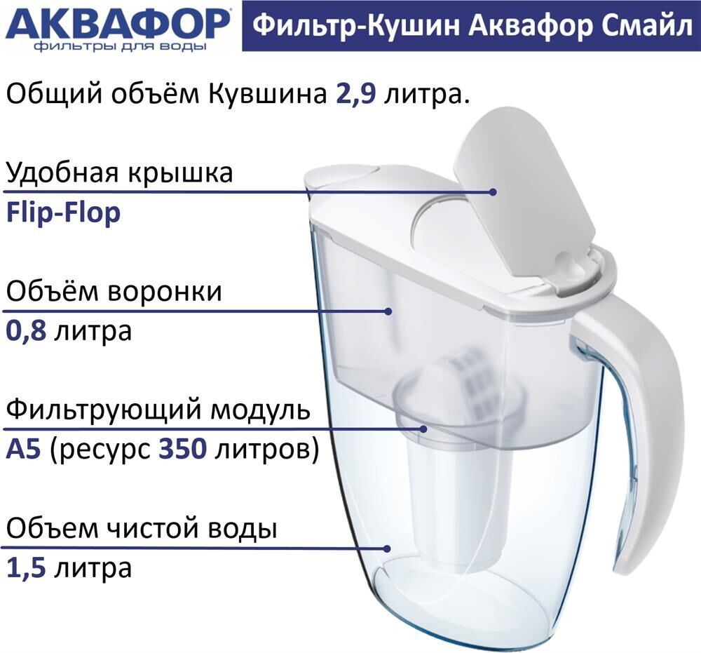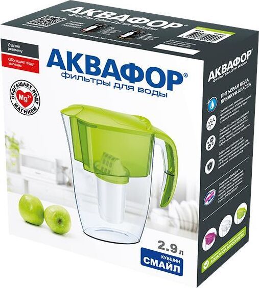 Очищает воду там, где вам нужно * Очень прост в использовании * Все детали выполнены из качественного пищевого пластика * Ресурс: 350 л * Скорость фильтрации: 0.2 л/мин * Объем кувшина / воронки: 2,4 / 1 л * Габариты: 26,7x10,2x26,7 см * Смайл очищает воду от: активного хлора, органических веществ, свинца, тяжелых металлов, коллоидного железа