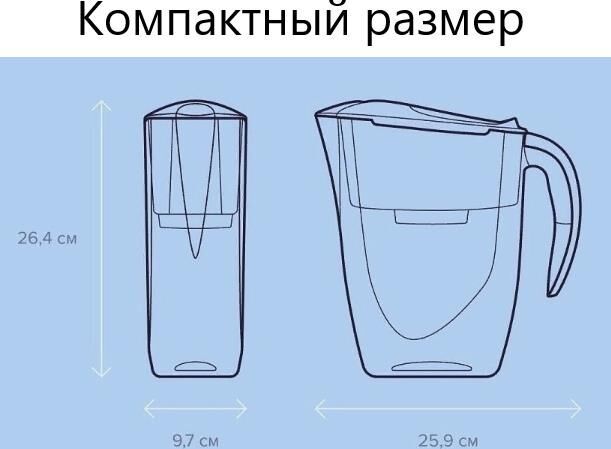 Очищает воду там, где вам нужно * Очень прост в использовании * Все детали выполнены из качественного пищевого пластика * Ресурс: 170 л * Скорость фильтрации: 0,3 л/мин * Объем кувшина / воронки: 2,4 / 0,8 л * Габариты: 26,7x10,2x26,7 см *
