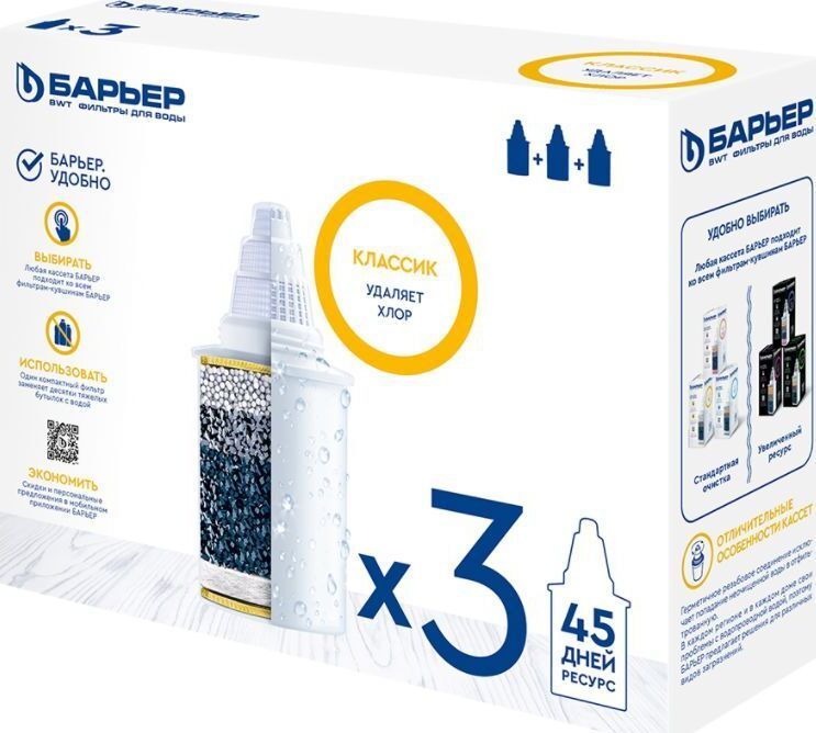 Кассеты «Классик» к фильтрам-кувшинам для воды являются экономичным и эффективным средством очистки от различного типа примесей: побочных продуктов хлорирования, механических примесей, а также неприятных запахов и привкусов. Комплект включает 3 кассеты, каждая имеет производительность 200 литров.