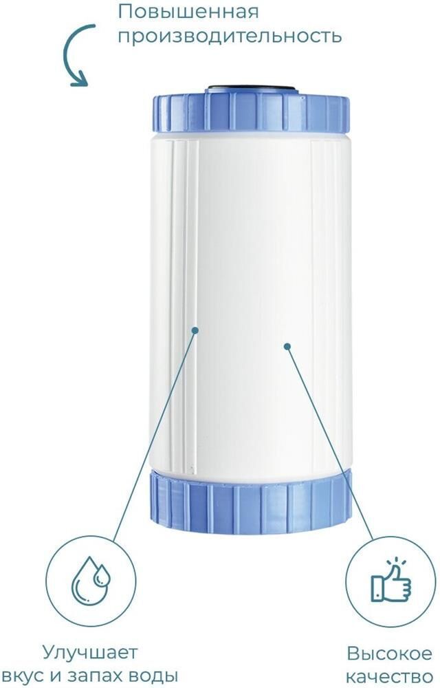 Картридж для магистральных фильтров стандарта Big Blue 10”. Применяется в целях финишной очистки холодной водопроводной воды. Обеспечивает эффективное кондиционирование и удаляет остатки загрязнений, которые не были задержаны на предыдущих ступенях фильтрации. Подходит для Корпус фильтра ПРОФИ BB10 G3/4", Корпус фильтра ПРОФИ BB10 G1"