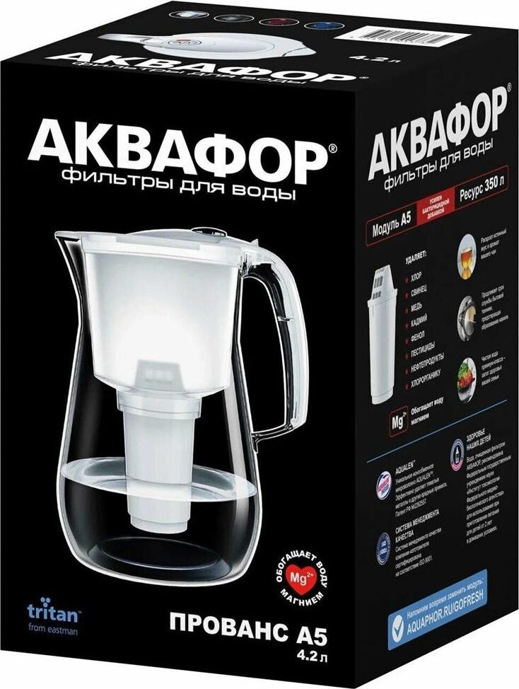 Кувшин «Прованс А5» с модулем А5 в комплекте. Комплектуется модулем А5. Технология «выдувного кувшина» с уникальным кантри-дизайном. Самый большой объём кувшина – 4,2 литра. Крышка Flip-top для быстрого набора воды. Умный индикатор ресурса. Противоударное ЭКО – стекло. Подходят все стандартные модули АКВАФОР серии В100-5.