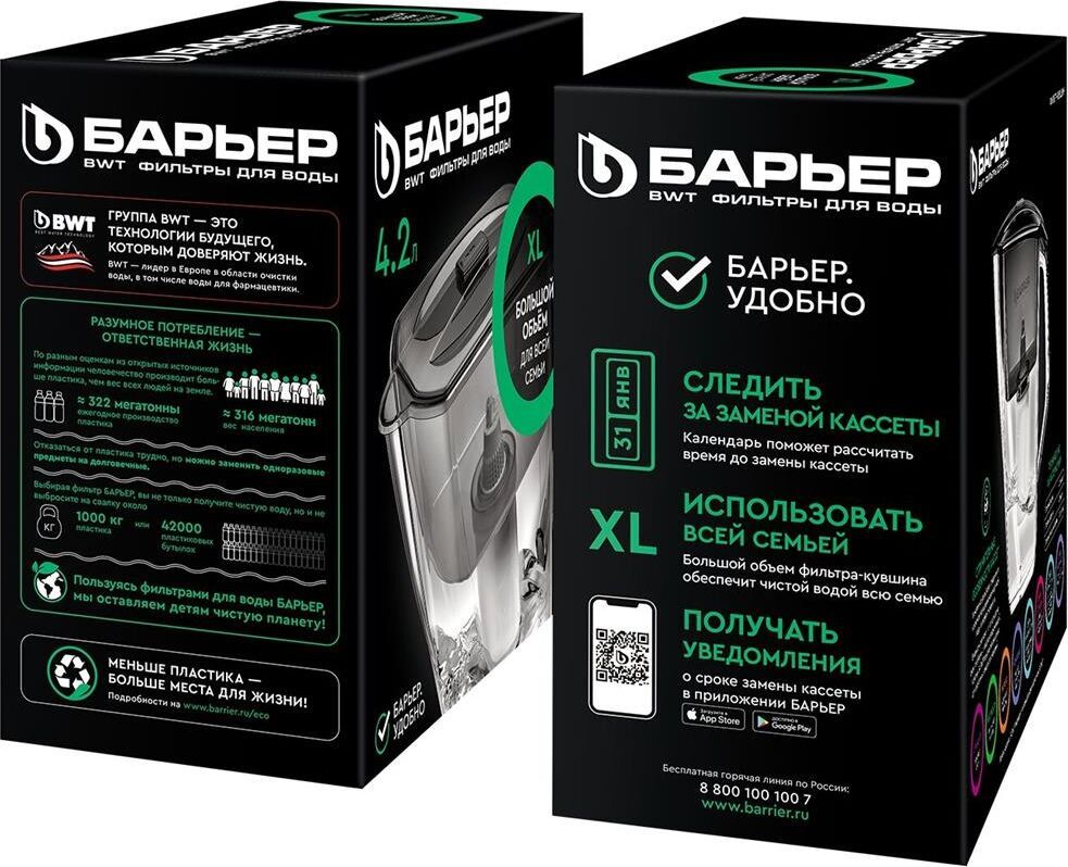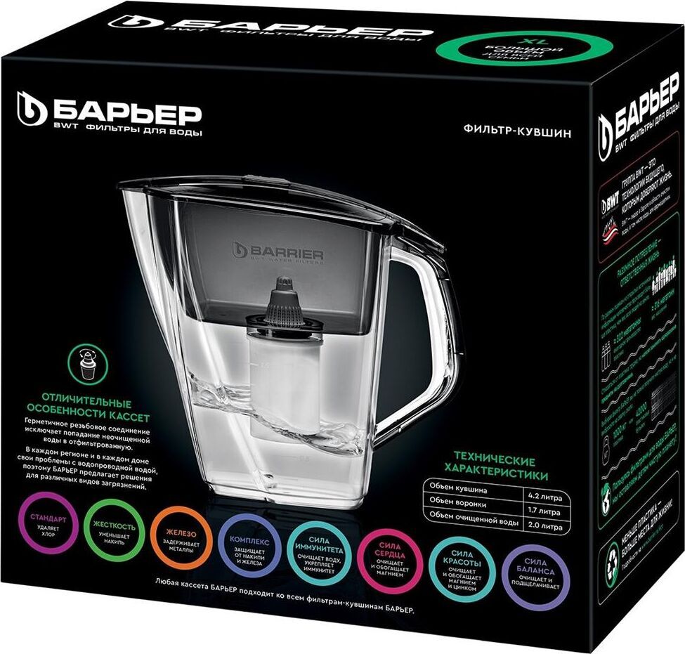Большой кувшин для всей семьи. Характеристики: объем кувшина 4,2 литра, объем воронки 1,7 литра, автоматически открывающаяся воронка, мерная шкала на корпусе, механический индикатор замены кассеты, срок службы не более 5 лет. Цвет: янтарь. Кассета "Стандарт" в комплекте (ресурс кассеты 350 л)
