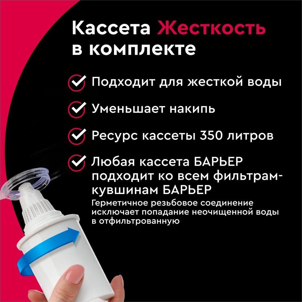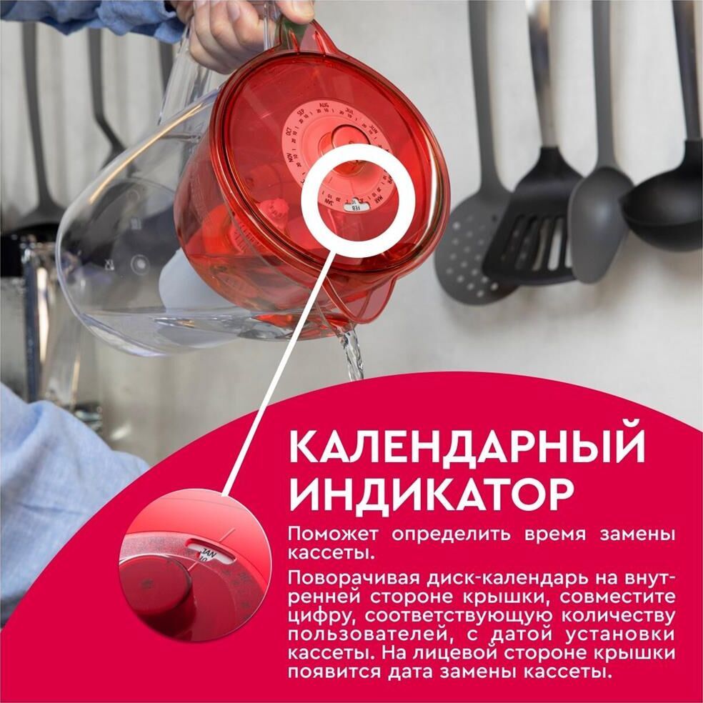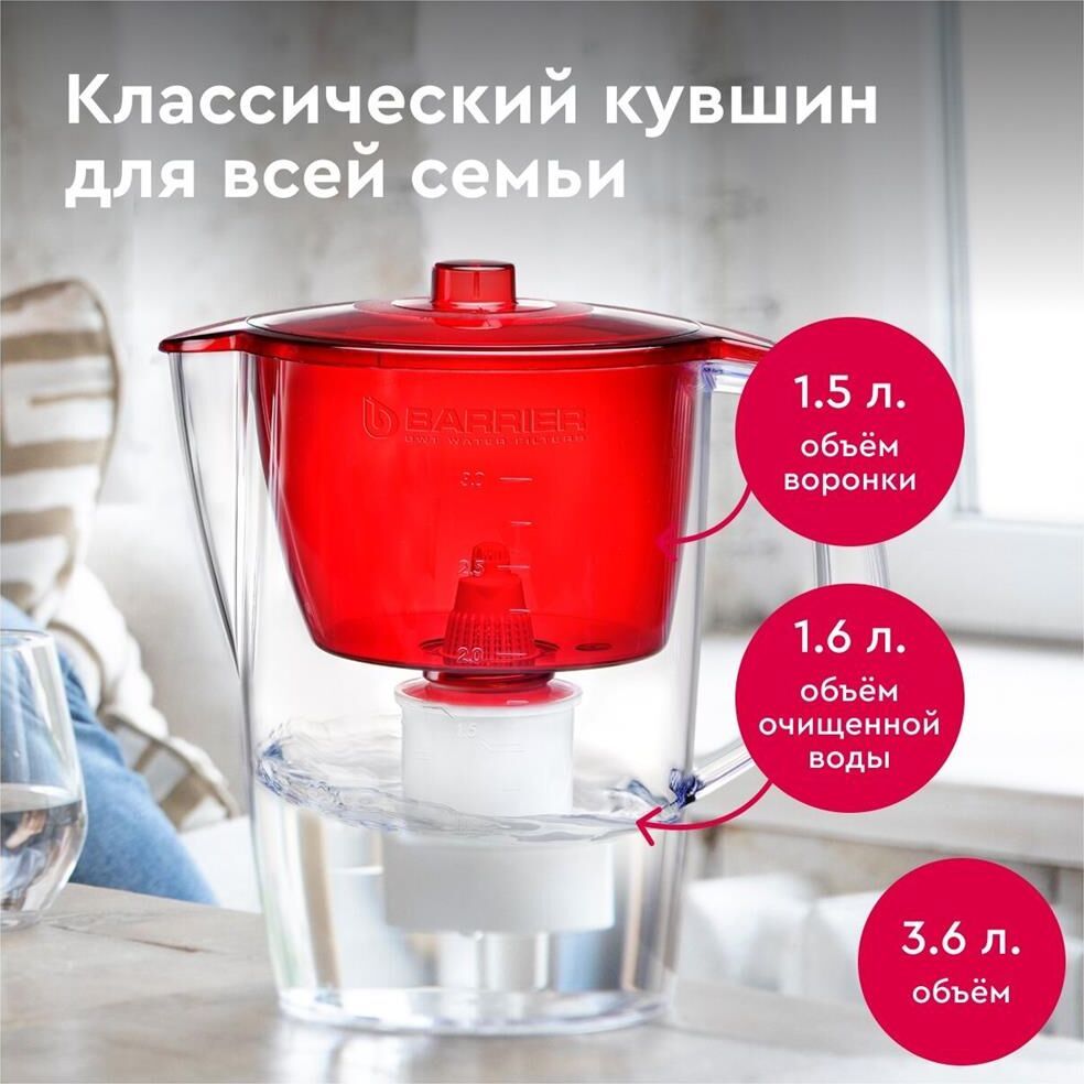 Классический кувшни для большой семьи, объем кувшина 3,6 литра, объем воронки 1,5 литра, классическая круглая форма, мерная шкала на корпусе, календарный индикатор замены кассеты, срок службы не более 5 лет, кассета в комплекте, ресурс кассеты 350 л.