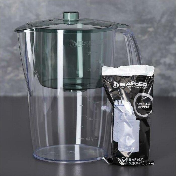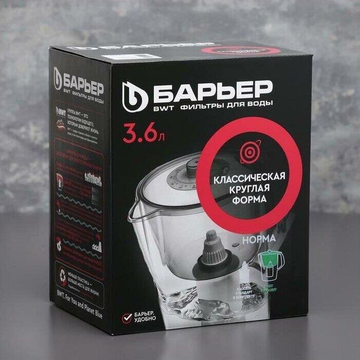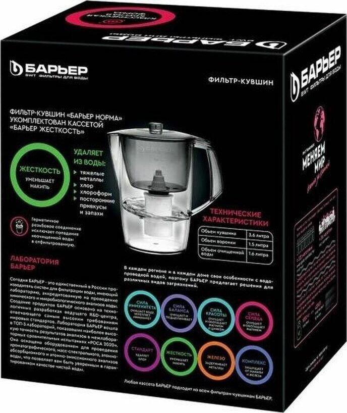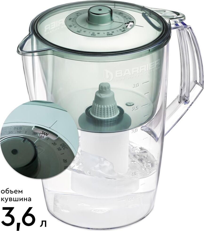 Классический кувшни для большой семьи, объем кувшина 3,6 литра, объем воронки 1,5 литра, классическая круглая форма, мерная шкала на корпусе, календарный индикатор замены кассеты, срок службы не более 5 лет, кассета в комплекте, ресурс кассеты 350 л.