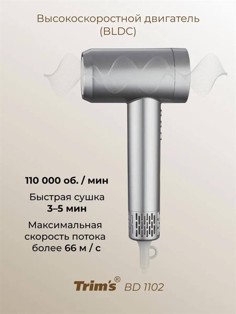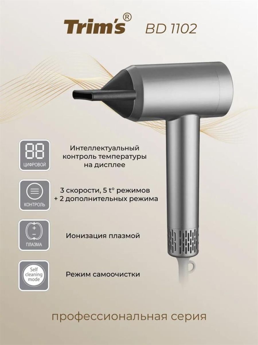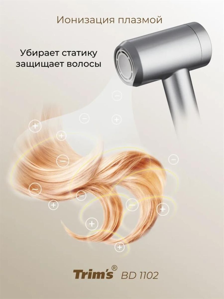 Подходит для профессионального и индивидуального использования Отвечает всем персональным требованиям для сохранения волос и создания укладки Обеспечивает Идеальное качество волос без потери времени и использования средств Преимущества: 1.Ионизация ПЛАЗМОЙ. Высокоскоростной поток воздуха переносит генерируемые частицы от корней до кончиков волос, убирая статику, делает волосы гладкими, послушными, защищает волосы от перегрева и сушки. 2.Высокоскоростной бесщеточный двигатель (BLCD) 110 000 об/мин, обеспечивает быструю сушку (3-5 мин) без высоких температур 3.Мульти комбинированные режимы: -5 стационарных температурных режима +турбо режим 3 скорости потока воздуха обеспечивают быстроту сушки 4.Низкое электромагнитное излучение , прибор безопасен для беременных и детей 5.Интеллектуальный режим самоочистки: Благодаря интеллектуальному управлению, двигатель вращается в обратном направлении, создавая обратный поток воздуха, очищая фен