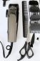 Работает от сети -длина ножа-46мм -имеет рычаг для регулировки длины состригаемых волос, диапазон от 0,-2мм) -частота 50Гц -номинальная потребляемая мощность 9Вт -имеет петлю на проводе для удобного хранения Комплектность: -Машинка -насадки (3,6,9,12мм) -масло для смазки -кисточка -расческа-ножницы -инструкция