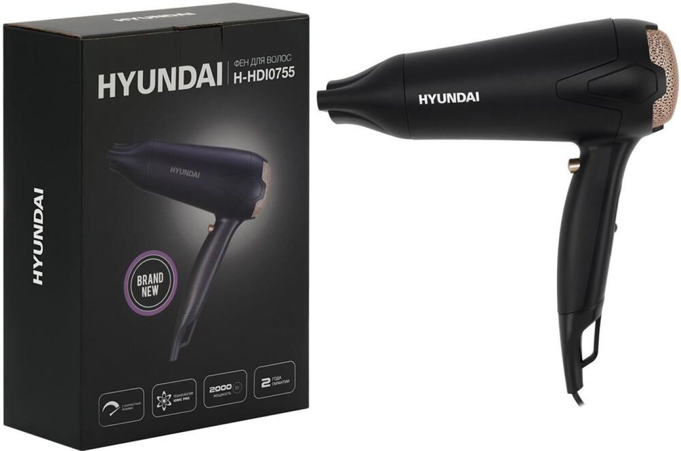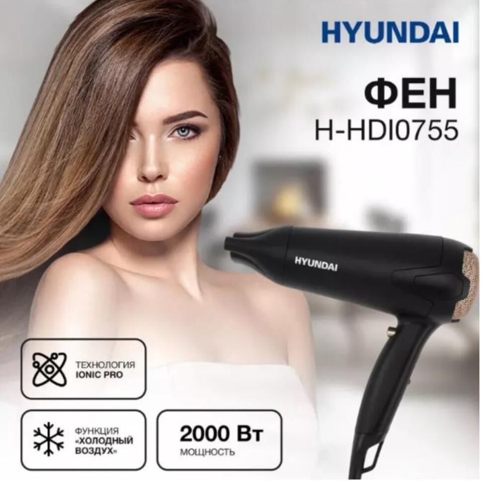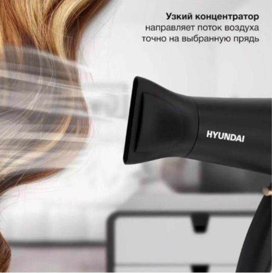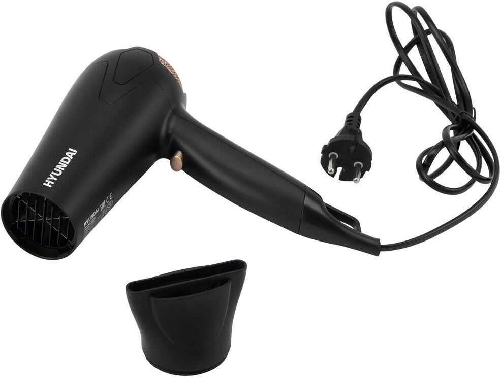 Бренд; HYUNDAI; Цвет товара; черный; Тип; фен; В комплекте; концентратор; Дорожный; да; Мощность фена; 2000 Вт; Количество режимов; 3; Количество режимов нагрева; 3; Количество скоростей; 2; Дополнительные функции; ионизация, подача холодного воздуха; Особенности; ионизация, съёмная решётка, холодный обдув; Длина сетевого шнура; 1.8 м