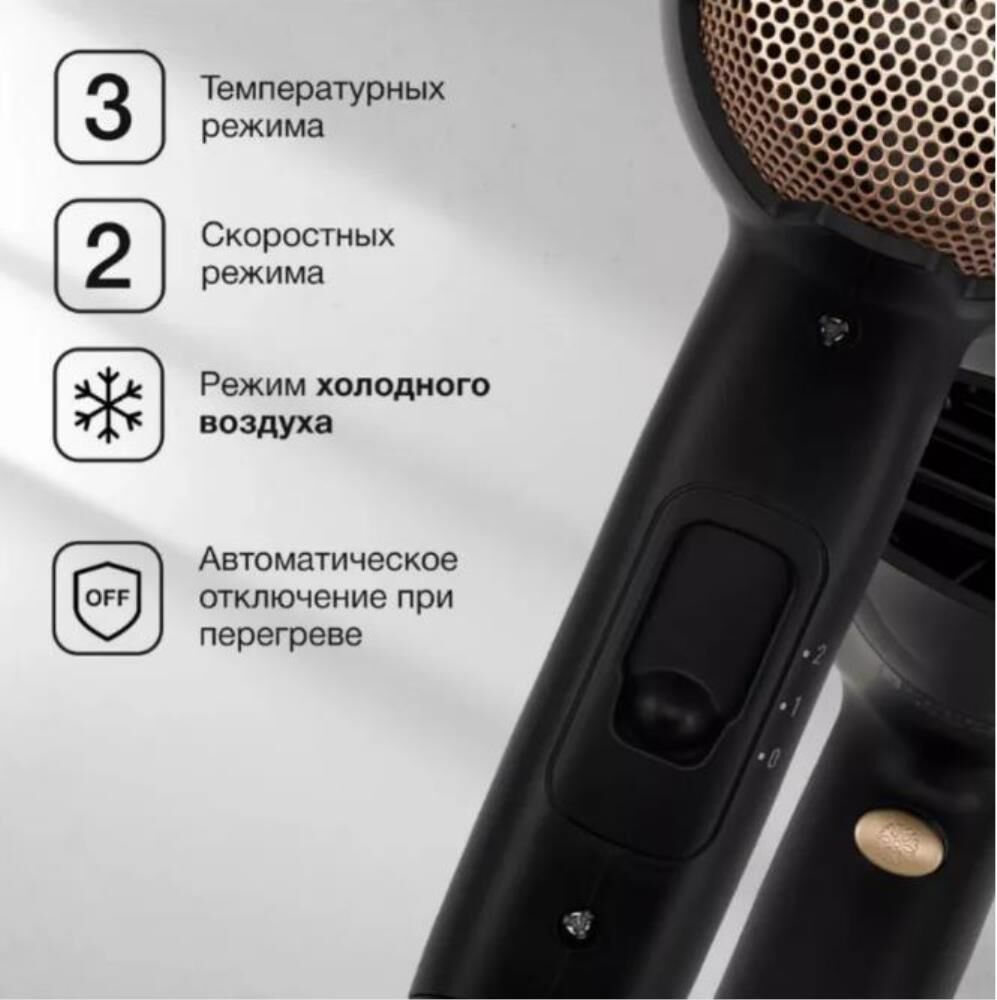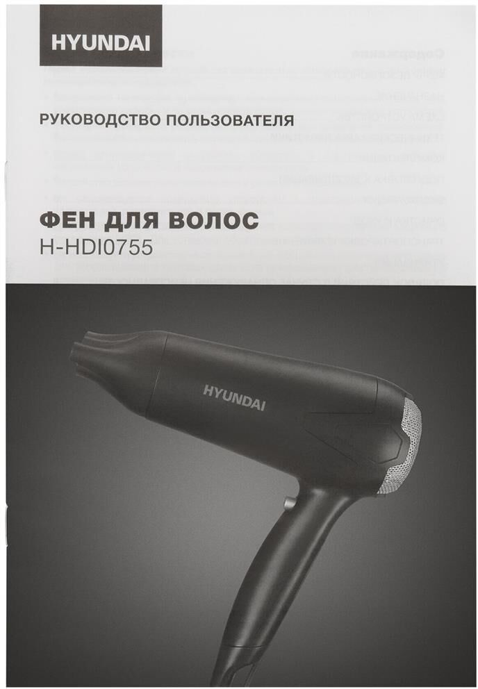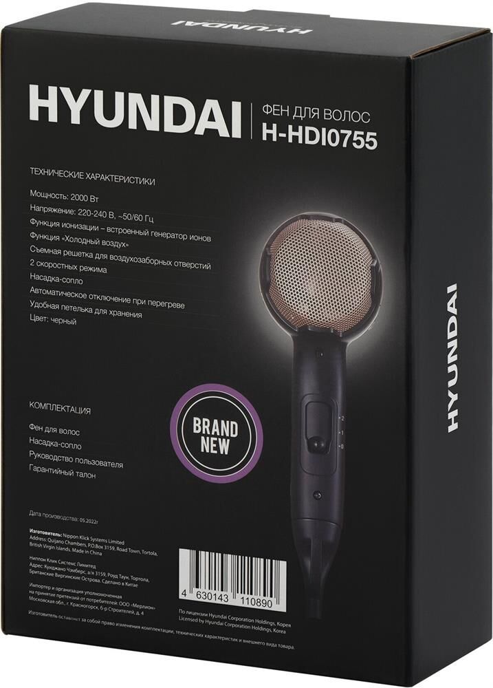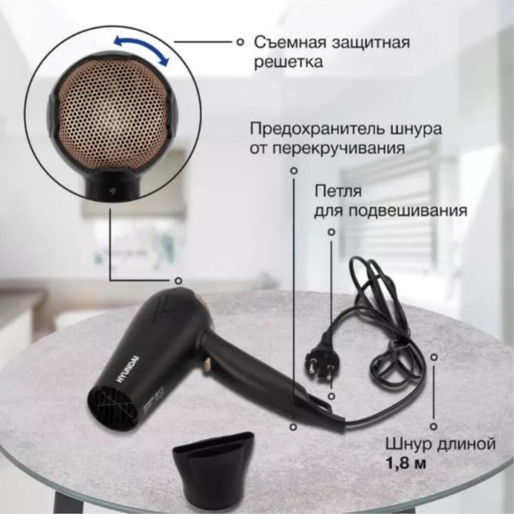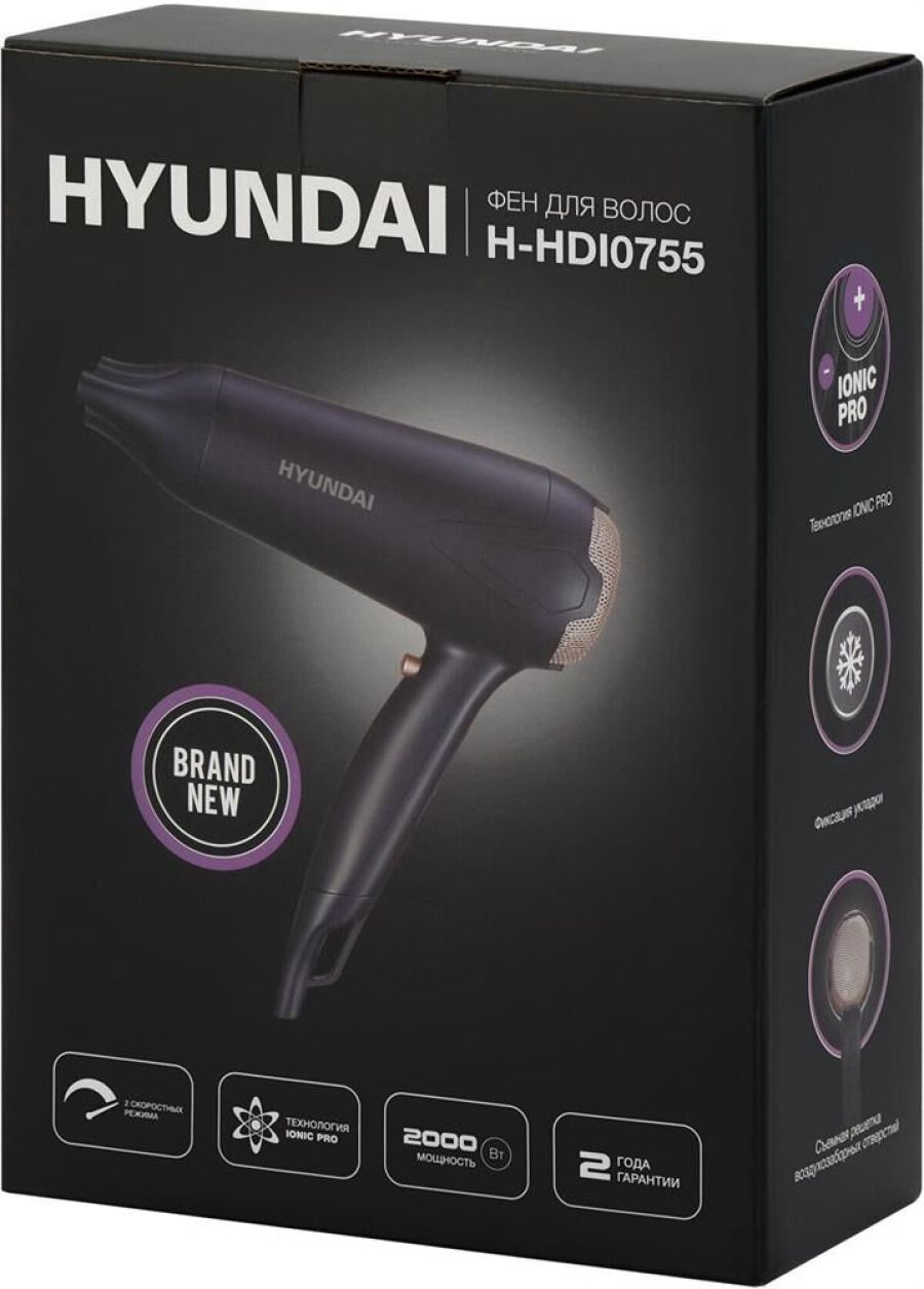Бренд; HYUNDAI; Цвет товара; черный; Тип; фен; В комплекте; концентратор; Дорожный; да; Мощность фена; 2000 Вт; Количество режимов; 3; Количество режимов нагрева; 3; Количество скоростей; 2; Дополнительные функции; ионизация, подача холодного воздуха; Особенности; ионизация, съёмная решётка, холодный обдув; Длина сетевого шнура; 1.8 м