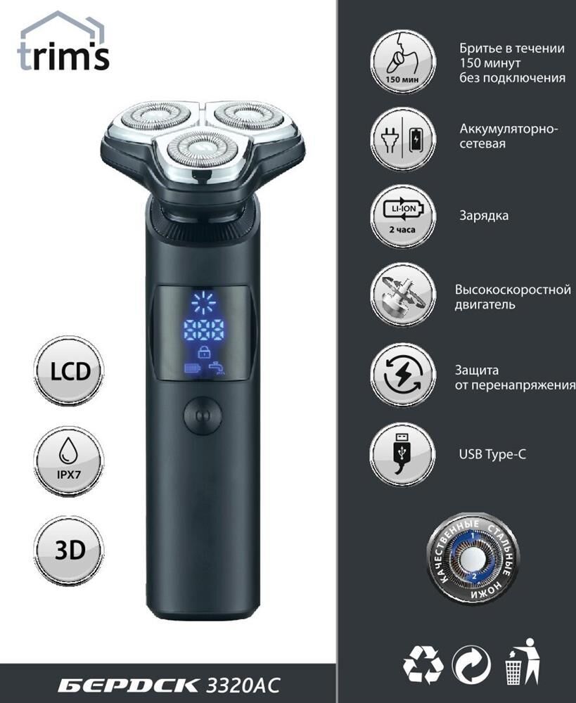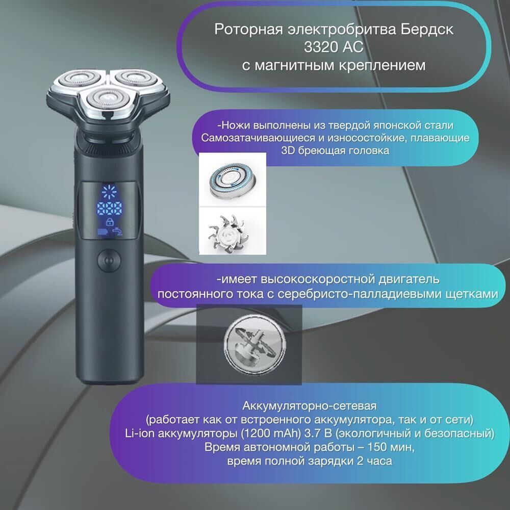 Электробритва Бердск 3320 АC с магнитным креплением Совершенство в простоте использования и качества исполнения Преимущества и характеристики: Имеет магнитное крепление (простое и долговечное в использовании) Удобное при чистке ножей Аккумуляторно-сетевая (работает как от встроенного аккумулятора, так и от сети) Li-ion аккумуляторы (1200 mAh) 3.7 В (экологичный и безопасный) Время автономной работы – 150 мин, время полной зарядки 2 часа Номинальная потребляемая мощность в режиме зарядки аккумуляторов 6 Вт В приборе установлен высокоскоростной двигатель постоянного тока с серебристо-палладиевыми щетками На данной модели предусмотрена защита от перенапряжения (в том случае, если адаптер 9 или 12 В Ножи выполнены из твердой японской стали Самозатачивающиеся и износостойкие, плавающие 3D бреющая головка Прибор оснащен LED дисплеем отражающим: -Время (оставшееся время работы в автономном режиме ) -Значок блокировки “Travel lock” -Значок зарядки -Значок загрязнения ножей Степень Влагозащиты IPX7, что позволяет пром