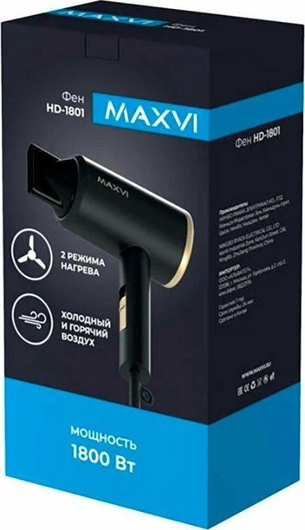 Мощность 1800 Вт, 2 режима нагрева, холодный и горячий воздух.
