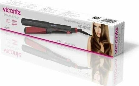Выпрямитель для волос Viconte VC-6747 70 Вт, Выпрямитель для волос, мощность 70 Вт, плавающие пластины с турмалиновым покрытием, размер пластин 120х32,6 мм, максимальный температурный нагрев 230 градусов, 6 температурных режимов, LCD дисплей, функция авт