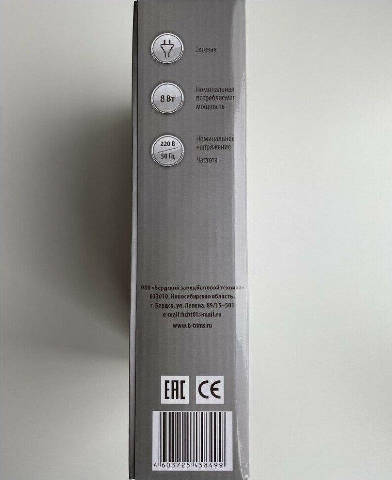 Машинка для стрижки волос .Качественные стальные ножи. Номинальное напряжение-220В переменного тока, частота-50Гц. Номинальная потребляемая мощность-8 Вт. Рабочий цикл 50 мин. АС-двигатель. Длина шнура - 1,8м. Машинка предназначена только для стрижки сухих волос.