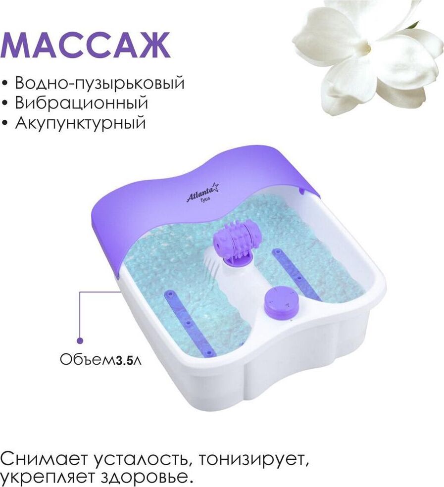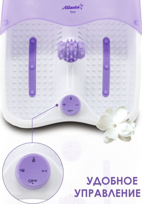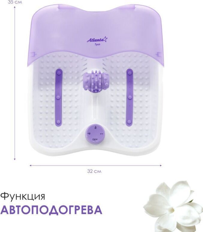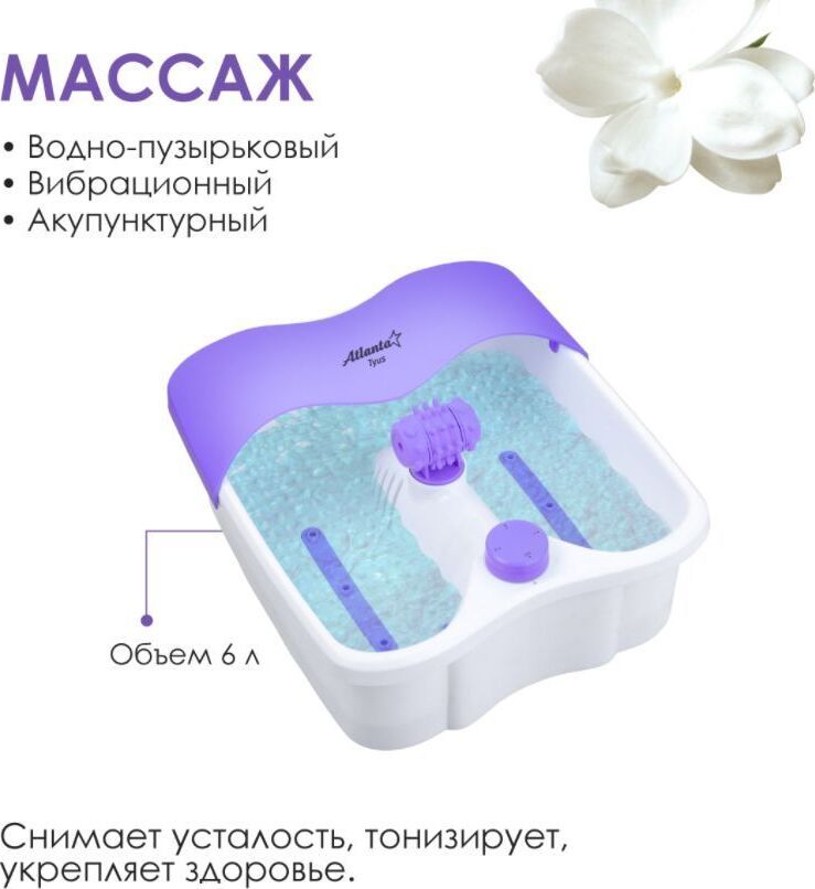 ATLANTA ATH-6413 (VIOLET) Гидромассажная ванночка для ног МАССАЖ Три вида массажа: водно-пузырьковый, вибрационный и акупунктурный массаж позволяет Вам быстро снять усталость с ног, а при регулярном использовании Вы существенно поправите свое здоровье, воздействуя мягко и естественно на активные точки вашего организма, которые во множестве расположены на ступнях. АВТО ПОДОГРЕВ Гидромассажная ванночка оснащена нагревательным элементом, позволяющим поддерживать температуру воды полностью автоматически.