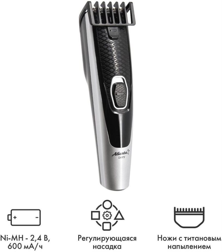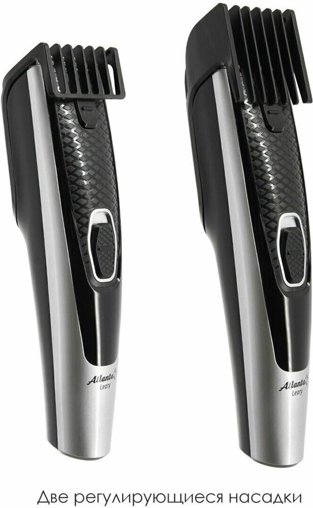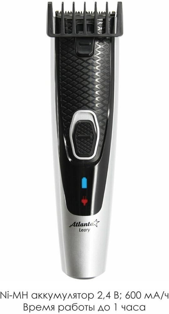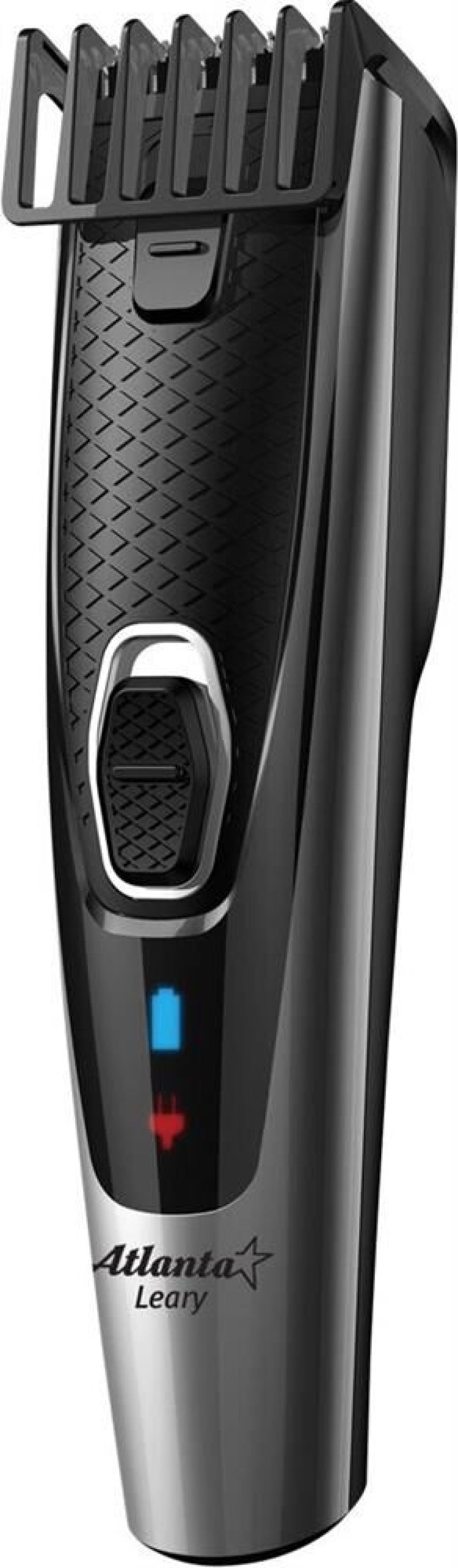 ATLANTA ATH-6911 (BLACK) Машинка для стрижки аккумуляторная Удобная подставка с зарядкой Питание от аккумулятора и через адаптер (1,9 м) Регулируемая насадка: 3, 6, 9, 12,15 мм Функция филировки Дополнительные аксессуары в комплекте Индикатор зарядки Прецизионные ножи из стали высокой прочности Долговечный, мощный аккумулятор Ni-MH 2,4 В; 600 мА/ч