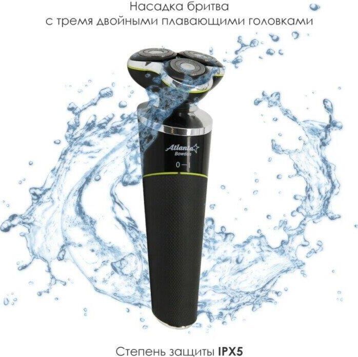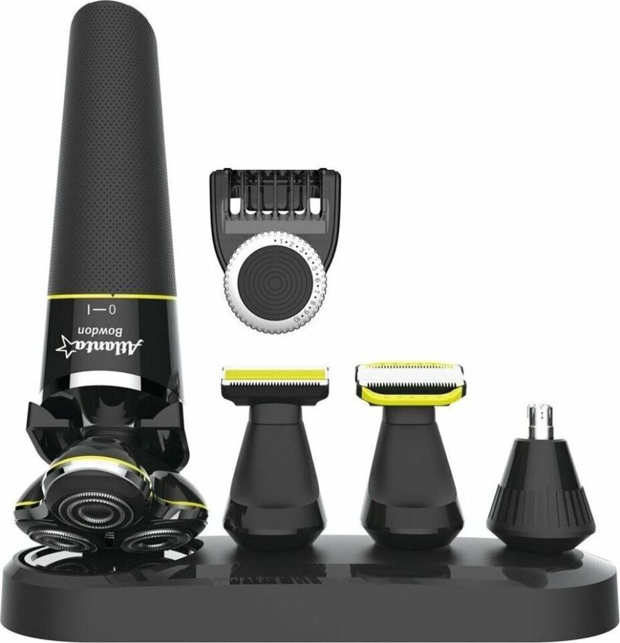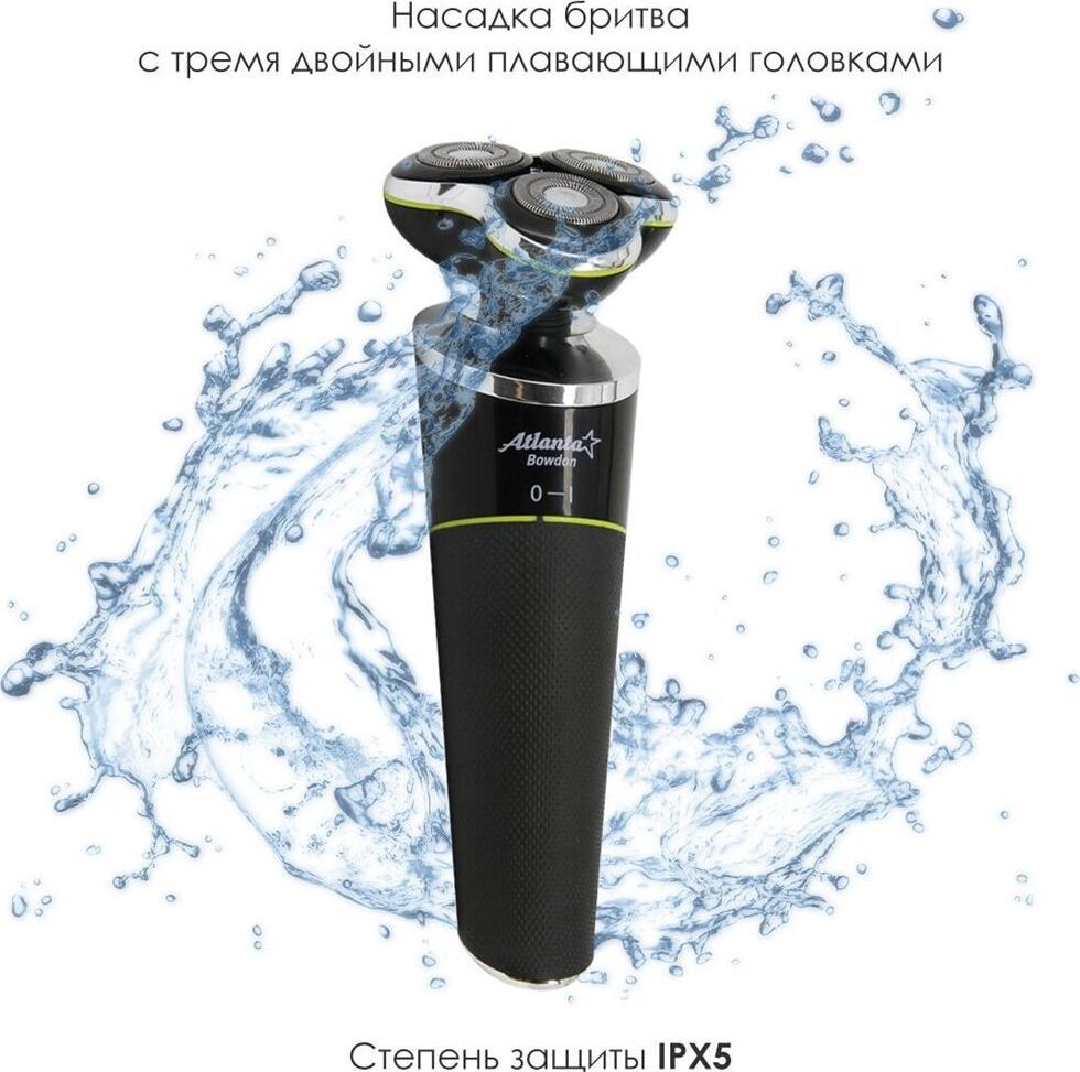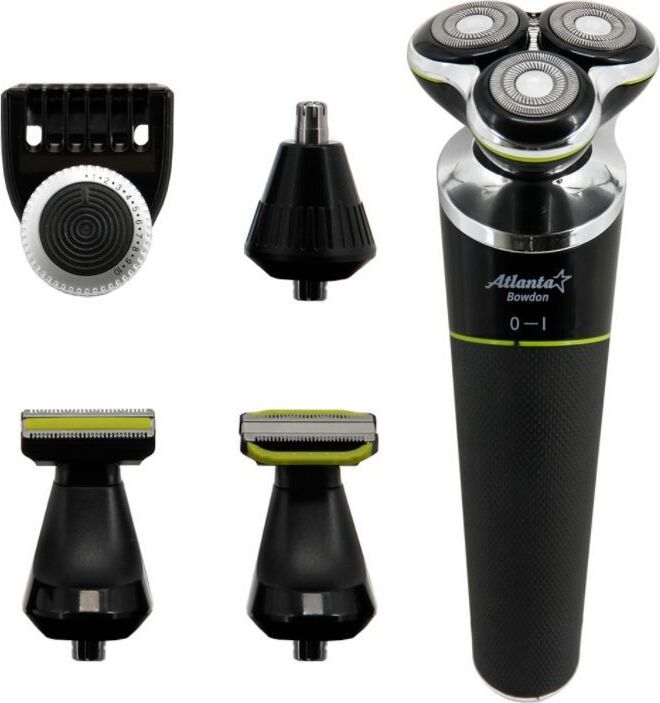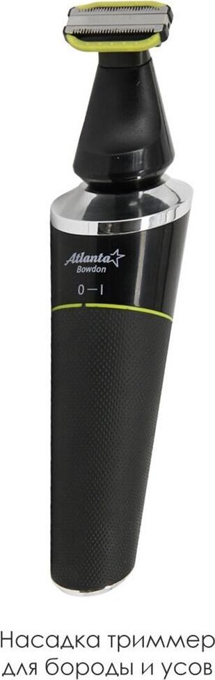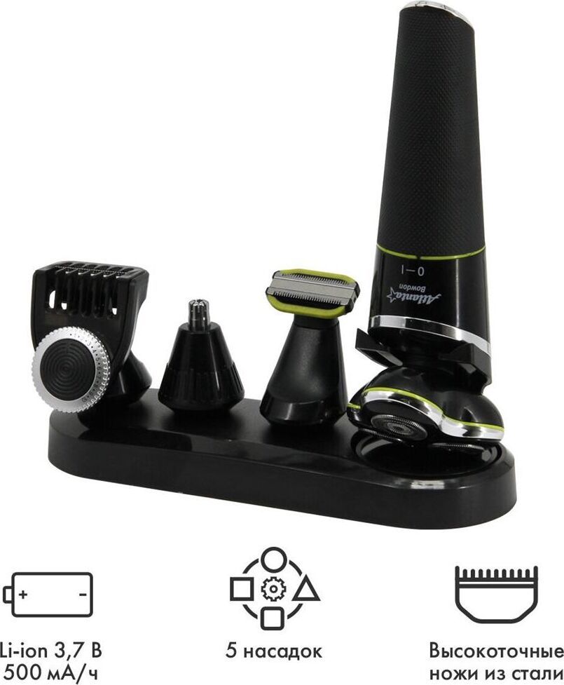 ATLANTA ATH-6926 (BLACK) Набор для стрижки и ухода Li-ion аккумулятор 3,7 В 500 мА/ч Насадка бритва с тремя двойными плавающими головками Насадка триммер для бороды и усов Насадка триммер для ухода за телом Насадка триммер для стрижки в носу и ушах Питание от аккумулятора и от кабеля USB Все насадки можно промывать в воде, степень защиты IPX5 Время зарядки 2 часа Время работы 1 час Подставка для всего набора