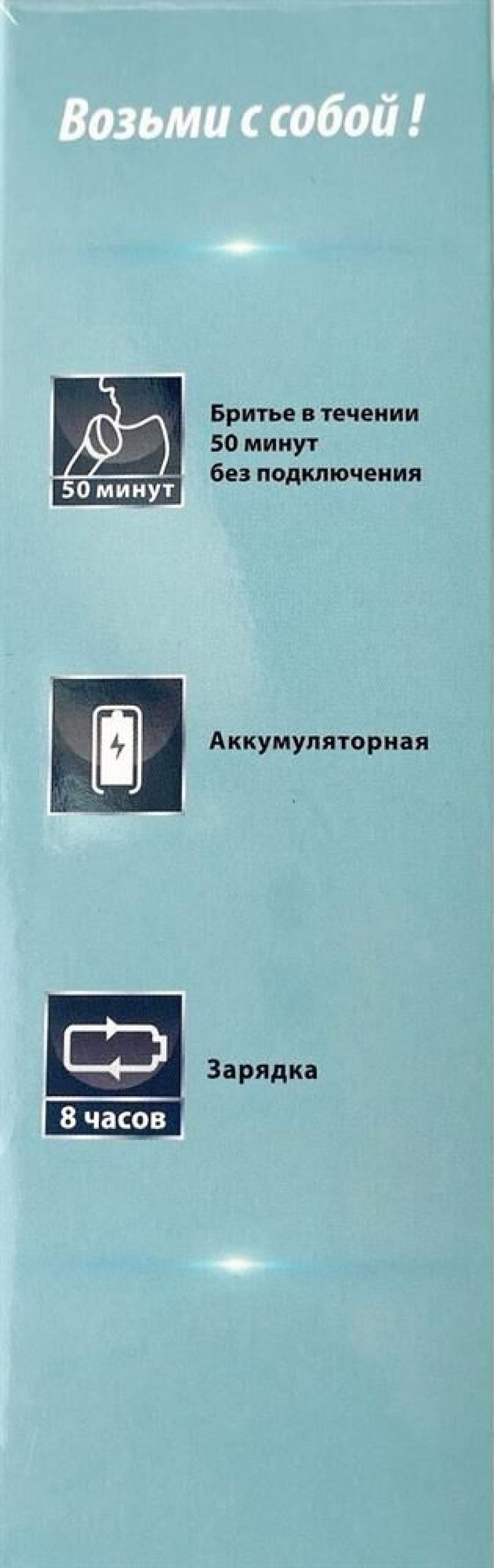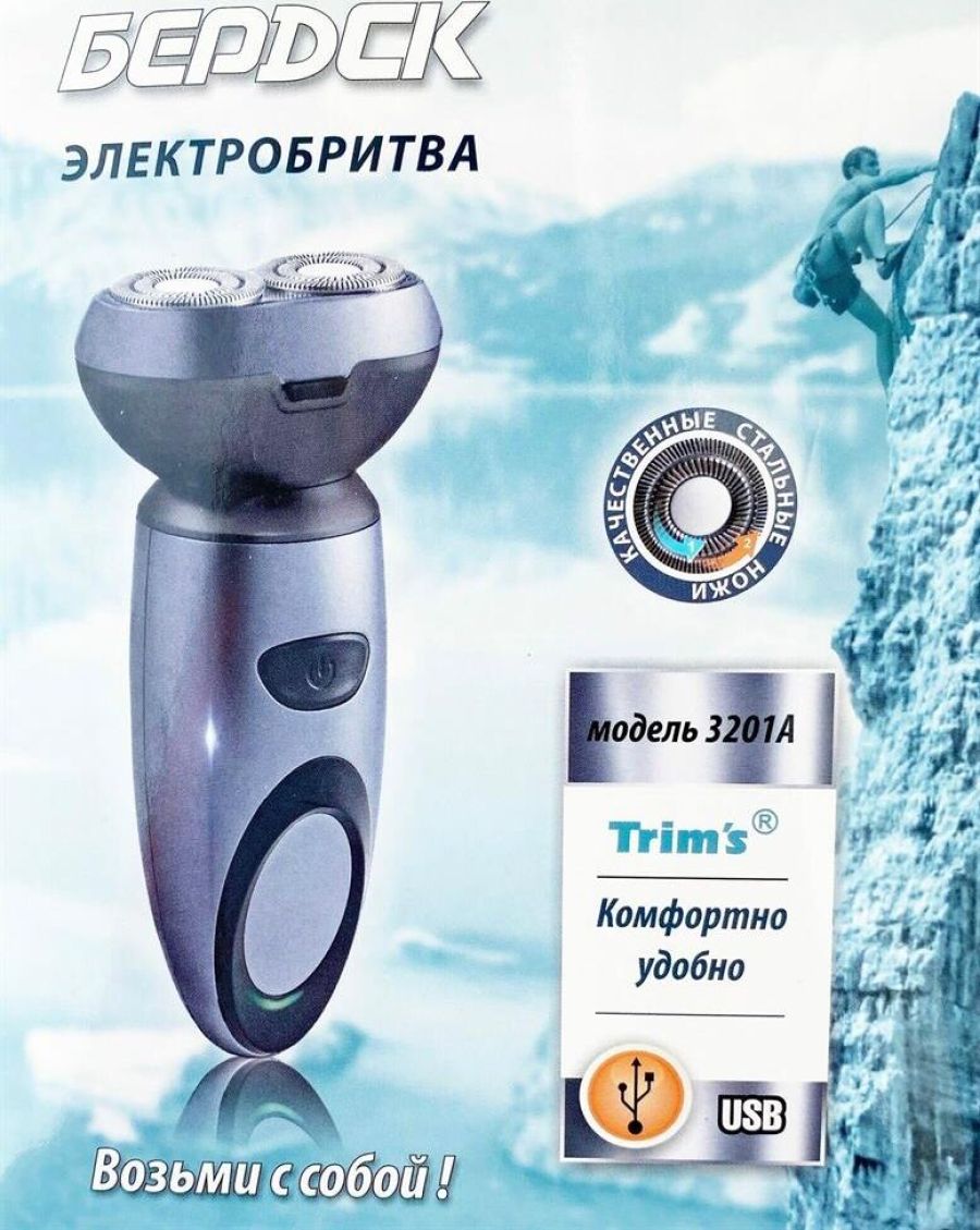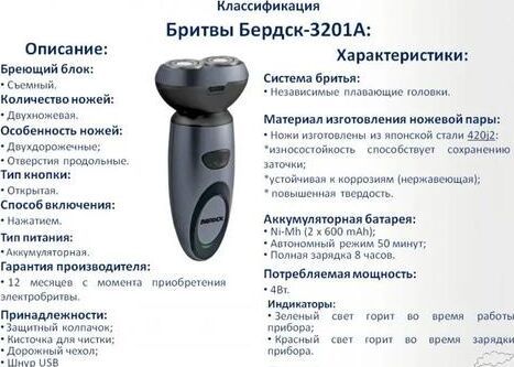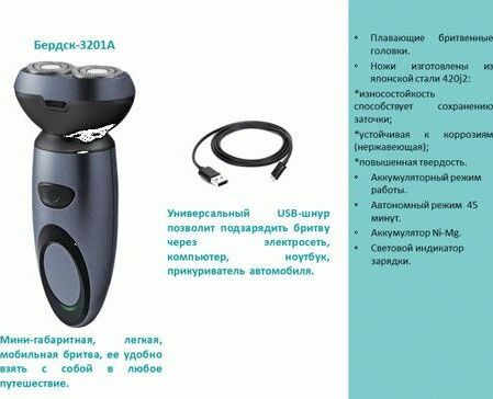 Качественные стальные ножи. Автономный режим 45 минут. Аккумуляторный режим работы. Двухдорожечные ножи. Световой индикатор работы. Система: плавающие независимые бритвенные головки. USB вход для заряда прибора.