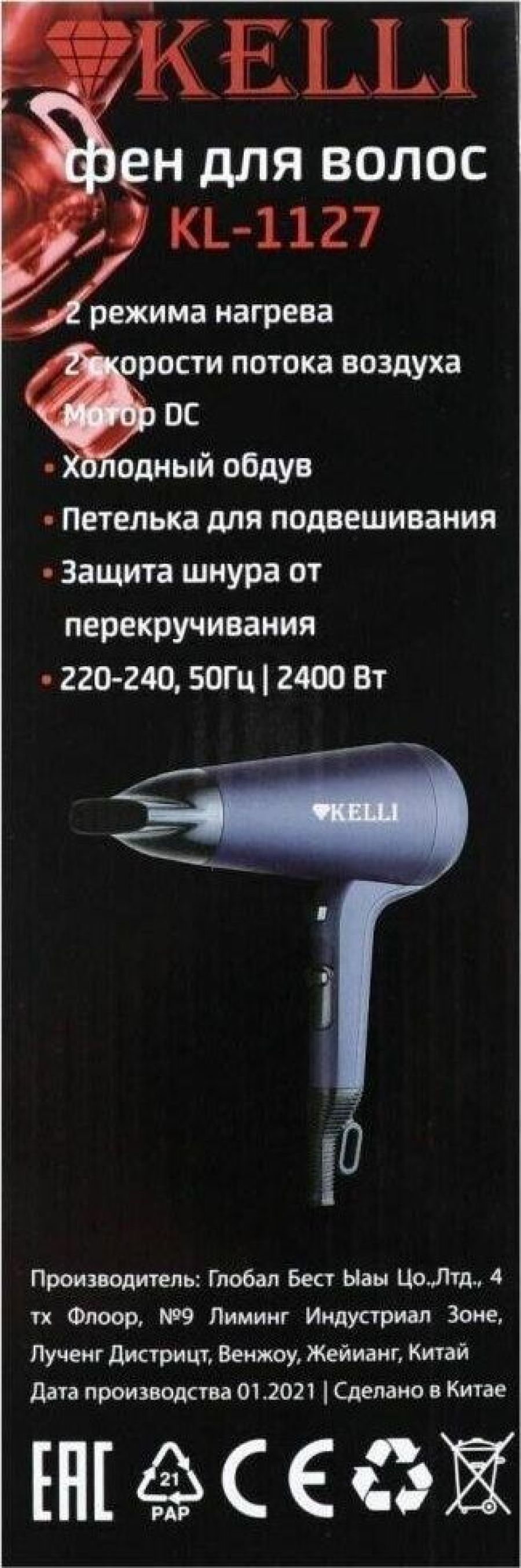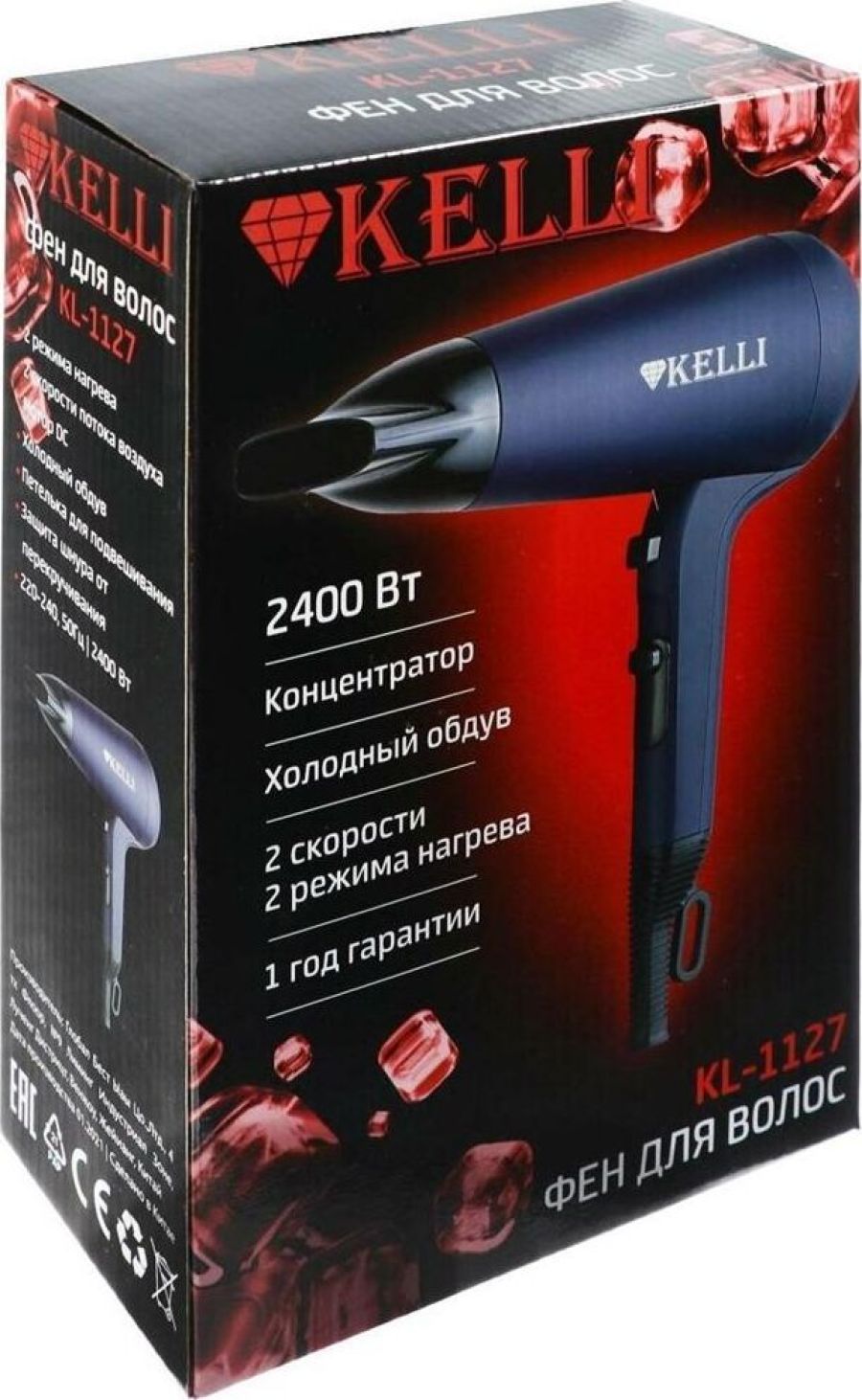 Фен для волос Мощность: 2400Вт 2 скорости 2 режима нагрева Кнопка холодного обдува Концентратор для сушки и моделирования Петелька для подвешивания Защита шнура от перекручивания Защита от перегрева Двигатель DC Сеть: 220-240В, 50Гц
