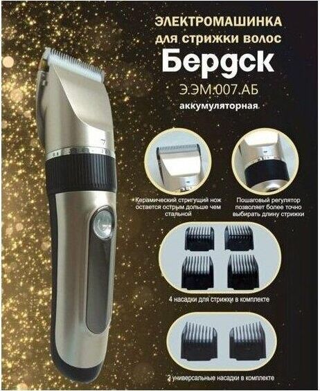 - Керамический стригущий нож остаётся острым дольше чем стальной - Пошаговый регулятор позволяют более точно выбирать длину стрижки - 4 насадки для стрижки в комплекте - 2 универсальные насадки в комплекте - Двигатель вращательного действия - Аккумуляторное питание - Адаптер и USB-шнур для зарядки - Номинальное напряжение зарядки 220 В - Частота 50 Гц - Номинальная потребляемая мощность при зарядке 5 Вт - Индикация уровня заряда аккумуляторов - Литиевые аккумуляторы - 3 часа зарядки - 2 часа работы Характеристики Тип: машинка для стрижки Источник питания: аккумулятор Количество насадок: 6 Материал лезвий: керамика Мощность: 5 Вт Быстрая зарядка: да Индикатор зарядки: да Нескользящая вставка на рукоятке: да Регулировка длины: поворотный регулятор