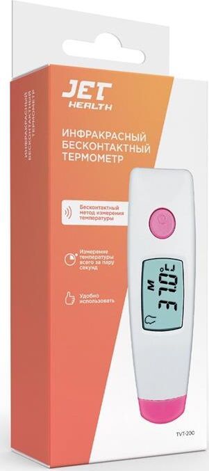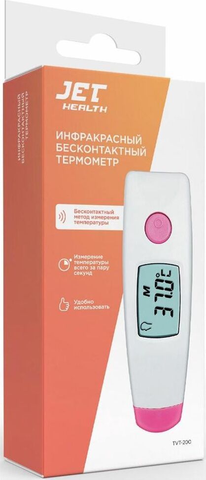 JET HEALTH TVT-200 розовый Термометр инфракрасный Температура хранения / транспортировки: -20 C - +50 С Диапазон измерения температуры тела: 32 С -43 С Диапазон измерения температуры поверхности предметов: 0 C -100 С Точность измерения: 0.1 С Ошибка измерения температуры тела: не более 0,2 С Ошибка измерения температуры предметов: не более 2% Дистанция измерения: 1 см для измерения температуры тела, 2 см для измерения температуры предметов. Автоматическое выключение: 30 сек Память последних 8 измерений температуры тела + 8 измерений температуры предметов Отображение температуры по шкале Цельсия Размер: 96*31*26 мм Вес: 49 г с батареей Питание: 1,5 В батарея AAA (LR03) Ресурс батареи: 5000 измерений.