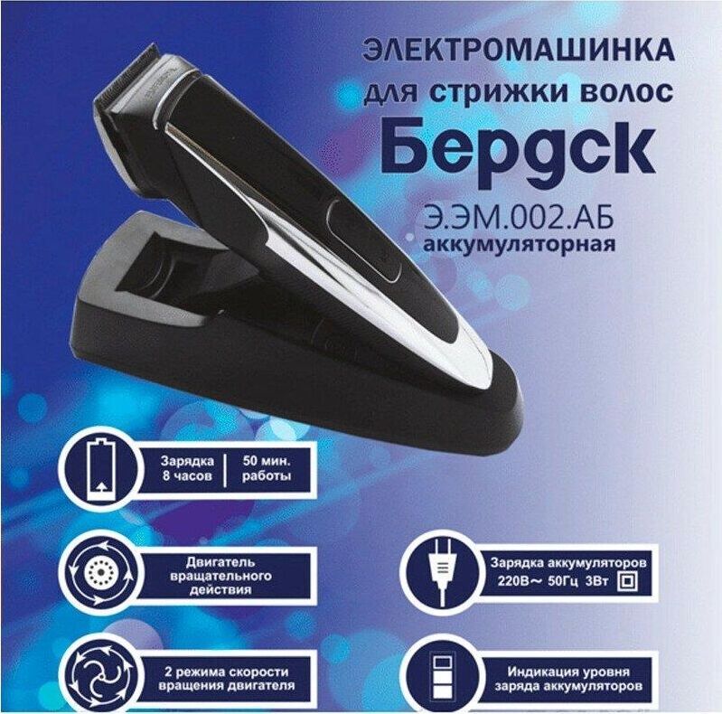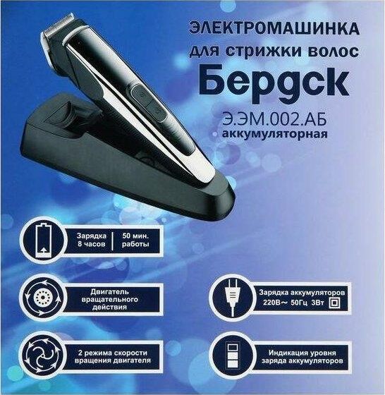 Двигатель вращательного действия, 2-е скорости вращения двигателя, Насадки для стрижки 4 шт. 3 / 6 / 9 / 12 мм. Подставка для зарядки. Аккумуляторное питание. Номинальное напряжение зарядки 220 В. Частота 50 Гц. Номинальная потребляемая мощность при зарядке 3 В. Индикация уровня заряда аккумулятора. 8 часов зарядки. 50 мин работы.