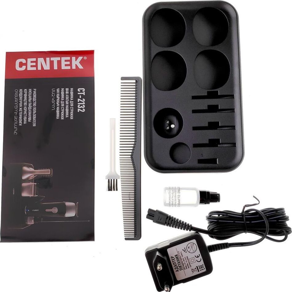 Набор для стрижки Centek CT-2132 10 предметов, водонепроницаемый корпус Мощность3 Вт Водонепроницаемый корпус Время непрерывной работыдо 45 минут Подставка для подзарядки и хранения База для подзарядки Полная зарядказа 8 часов Сменные насадки3 мм, 6 мм, 9 мм, 12мм 10 предметов для безграничного творчества10 в 1 Аксессуары: масло для смазки, щеточка для чистки